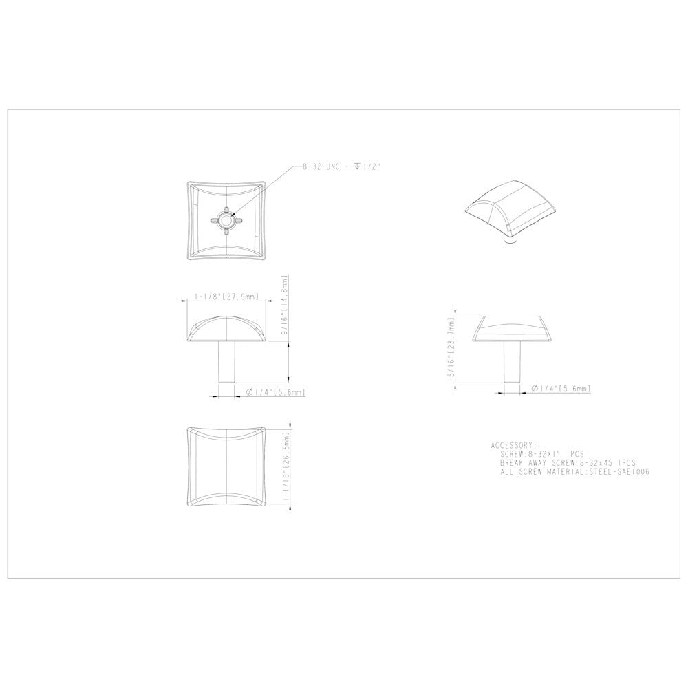 An arched square with outwardly curved contour design make this Satin Nickel 1-1/8" overall length knob from Glendale by Elements the perfect accent for many cabinet styles. This accommodating Elements collection also features a coordinating flared square foot arch pull and is available in nine fabulous finishes for various design choices. Each item is individually wrapped to protect the item from damage. Attachment hardware is included.