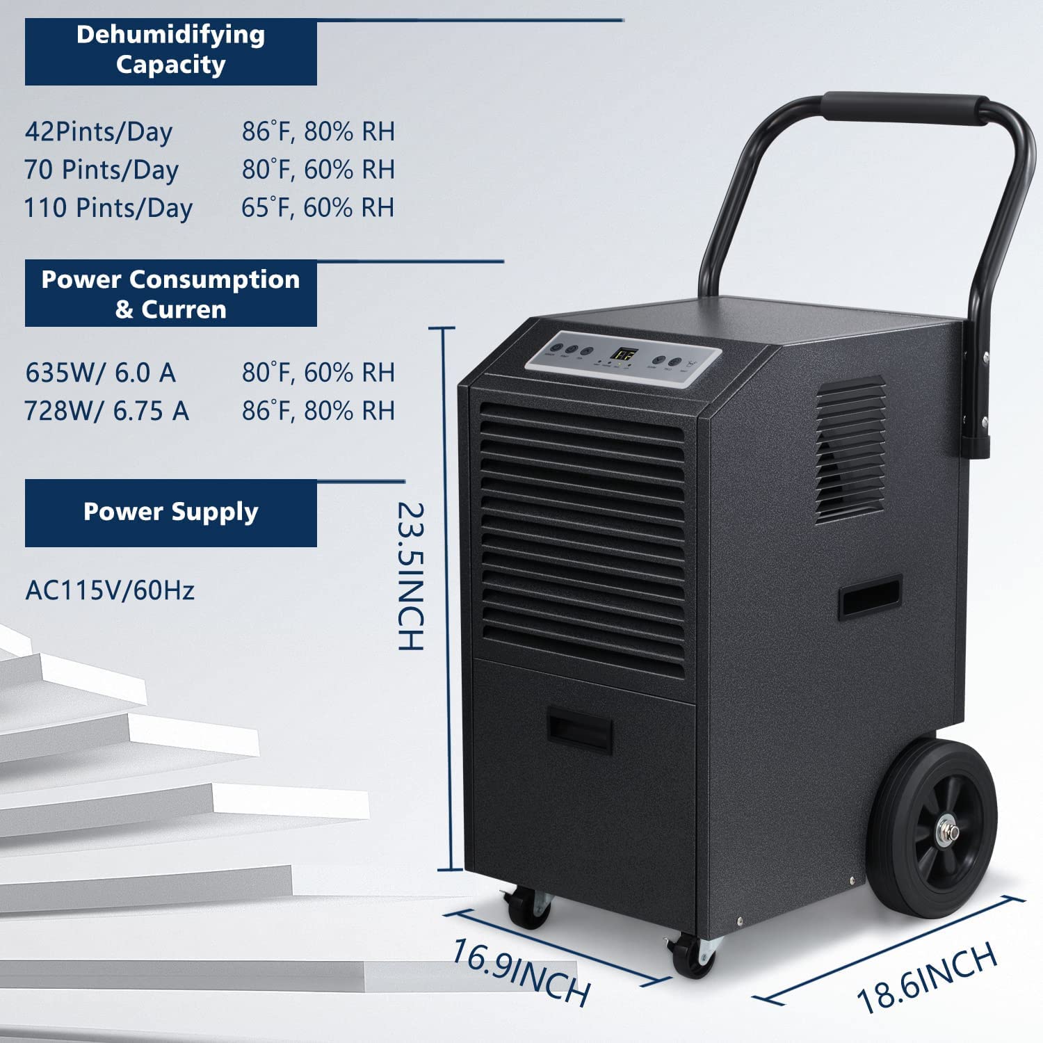 - With a fast dehumidification rate of up to 110 pints per day, the dehumidifier is suitable for emergency water repairs, quick structure drying, and maintaining constant humidity levels.