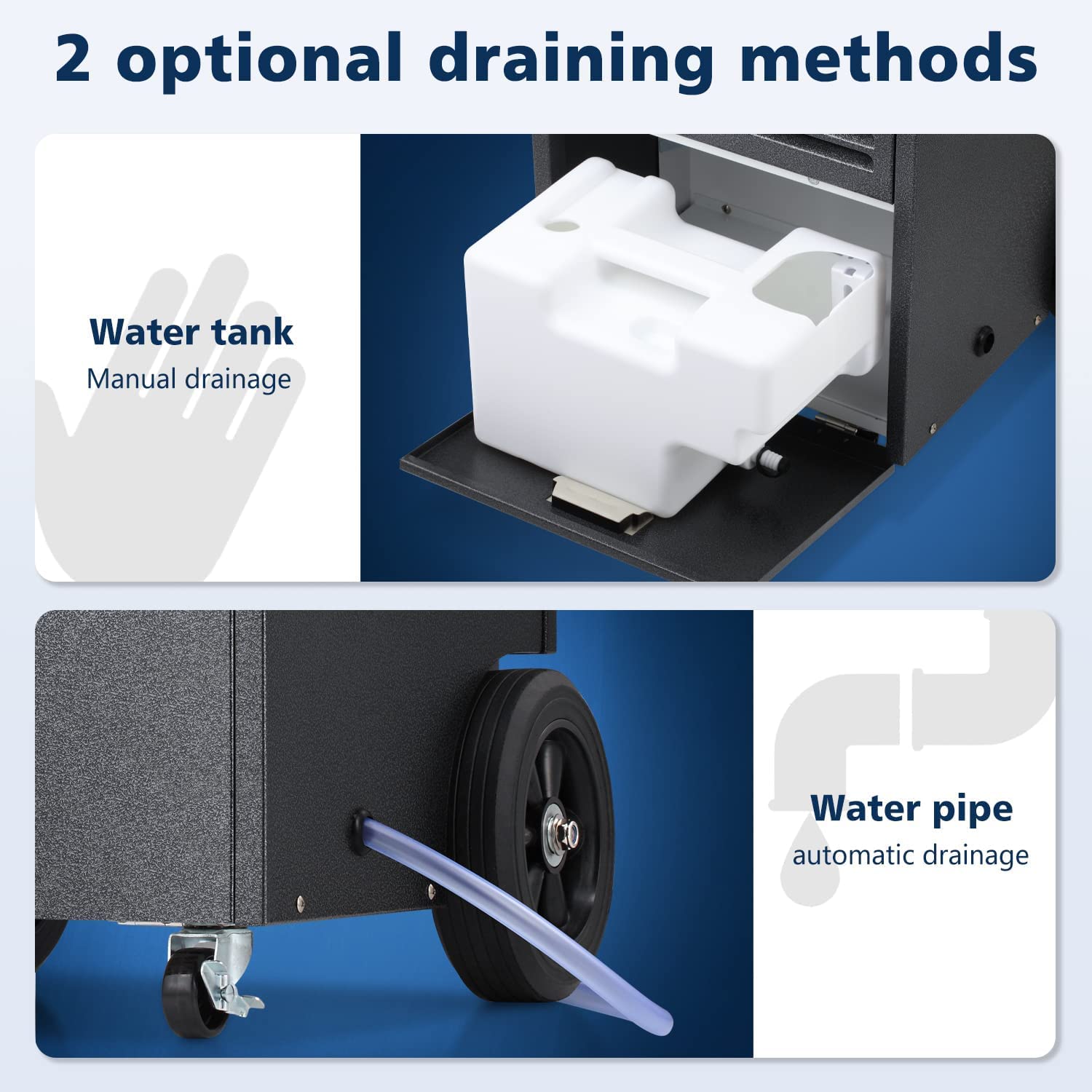 - Two easy ways to drain excess water include using the included drain hose or emptying the 1.3-gallon water tank when full.