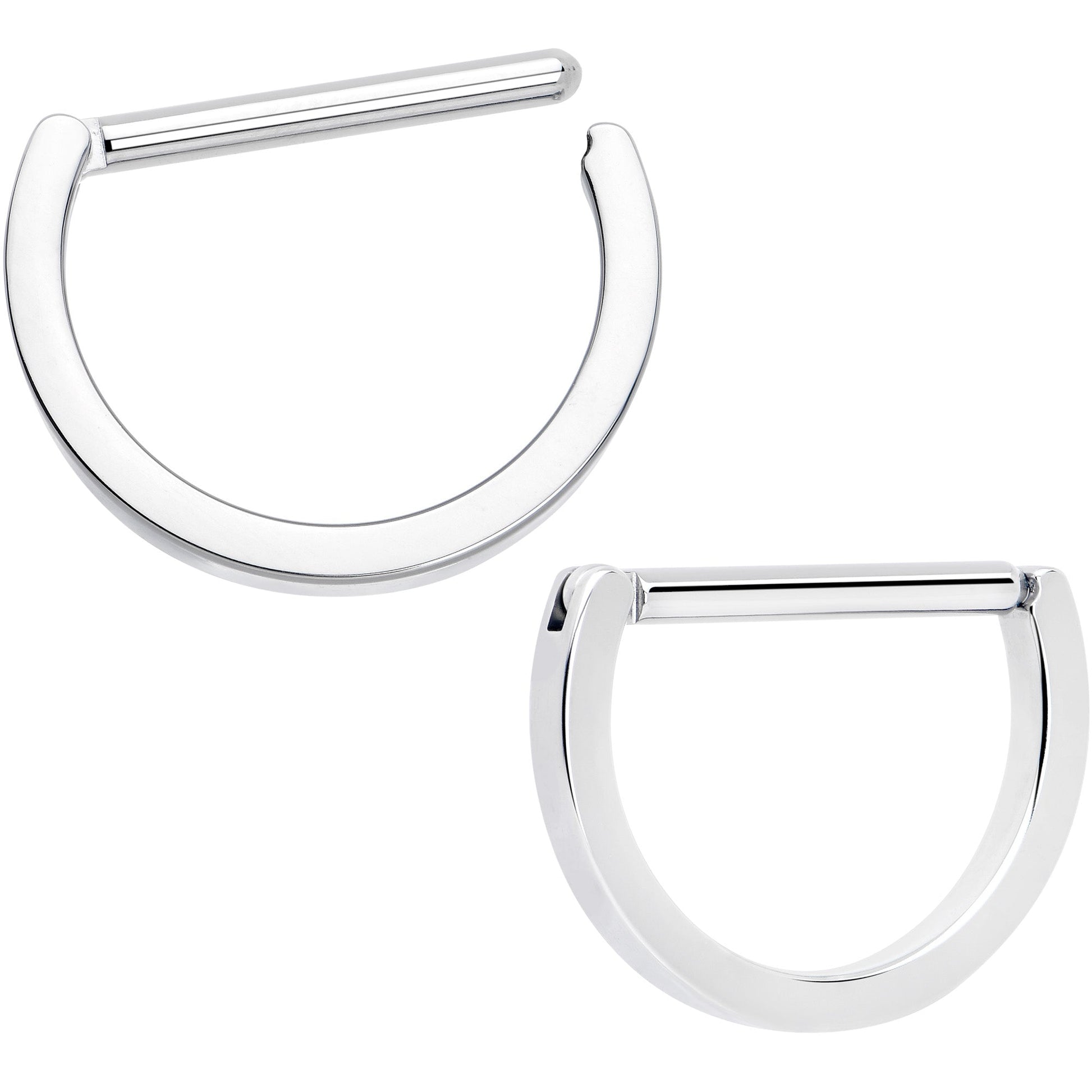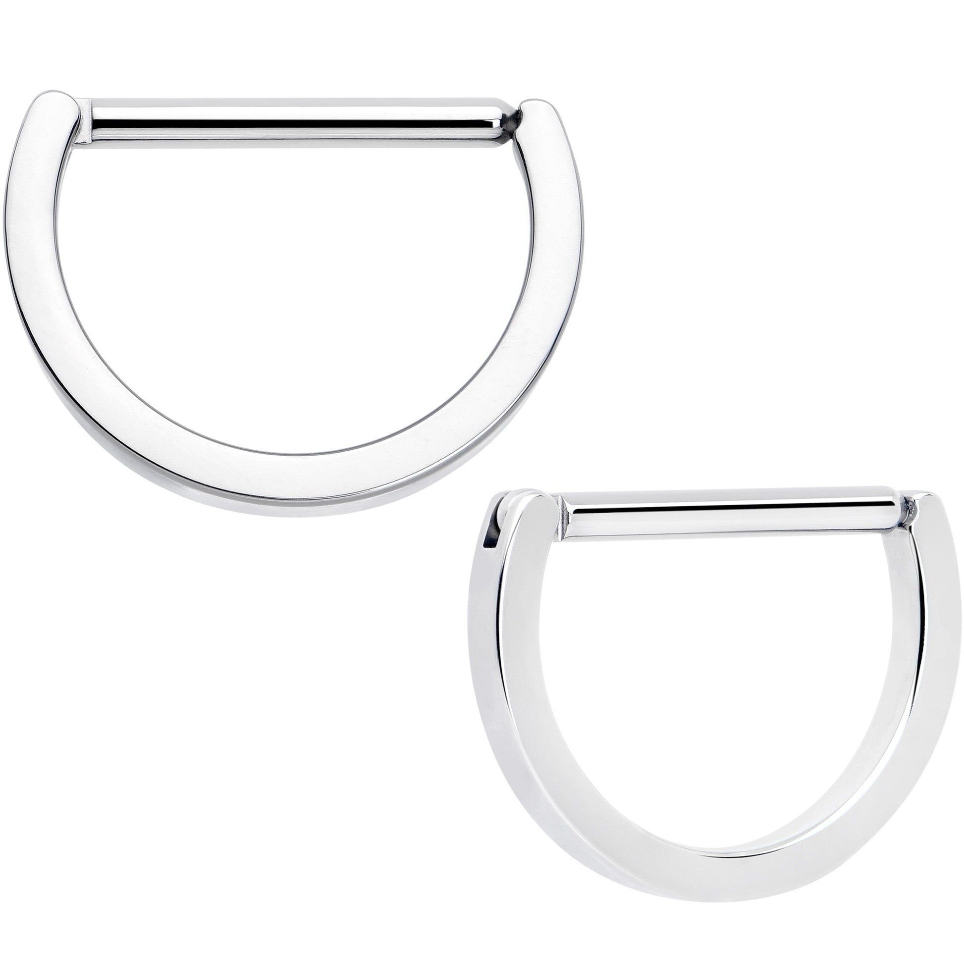 You'll definitely be digging the D with this 14 gauge nipple jewelry. It's made with 13mm ASTM F-136 titanium hinged straight barbells 9.65mm rise. They features a simple D-shaped design that's both subtle and stylish. They also feature a hinged, clicker design that makes insertion and removal snap. Give your look the D with these elegantly simple nipple piercing rings. Sold as a set of two.Specifications