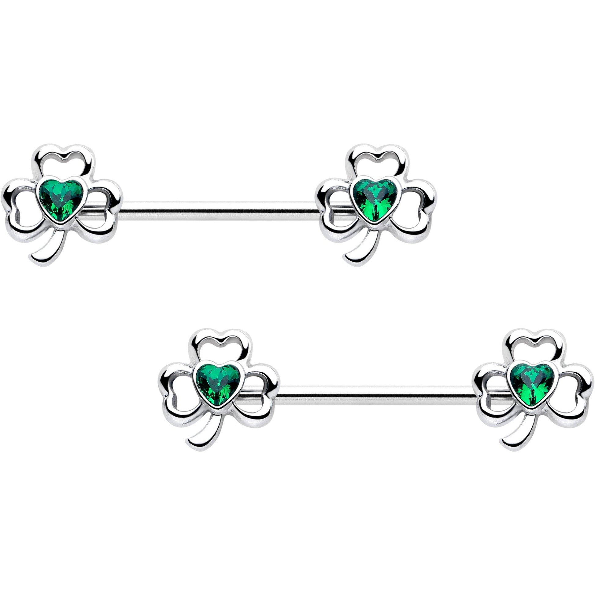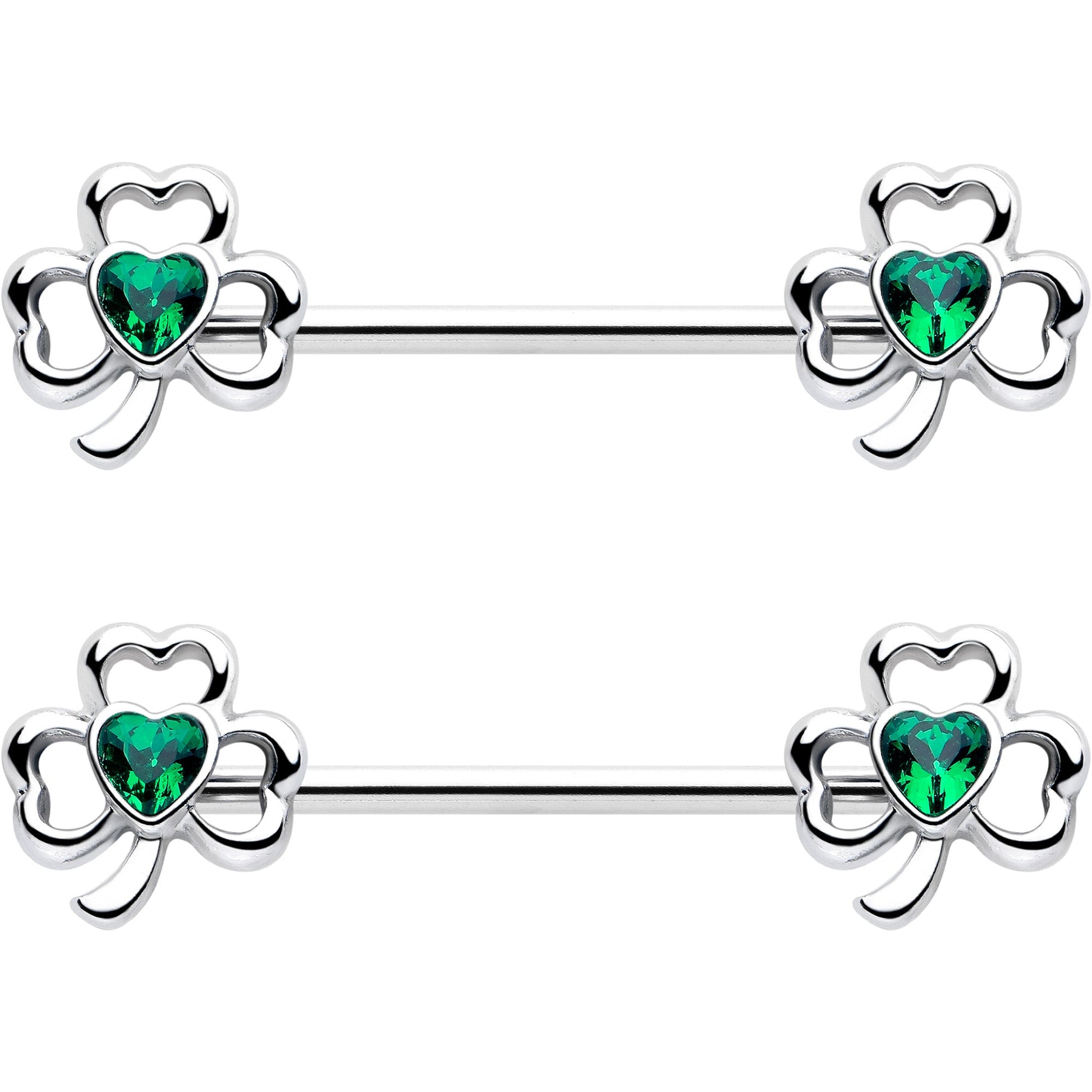 14G 3/4 Green Gem Heart Shamrock St Patricks Nipple Ring Set
