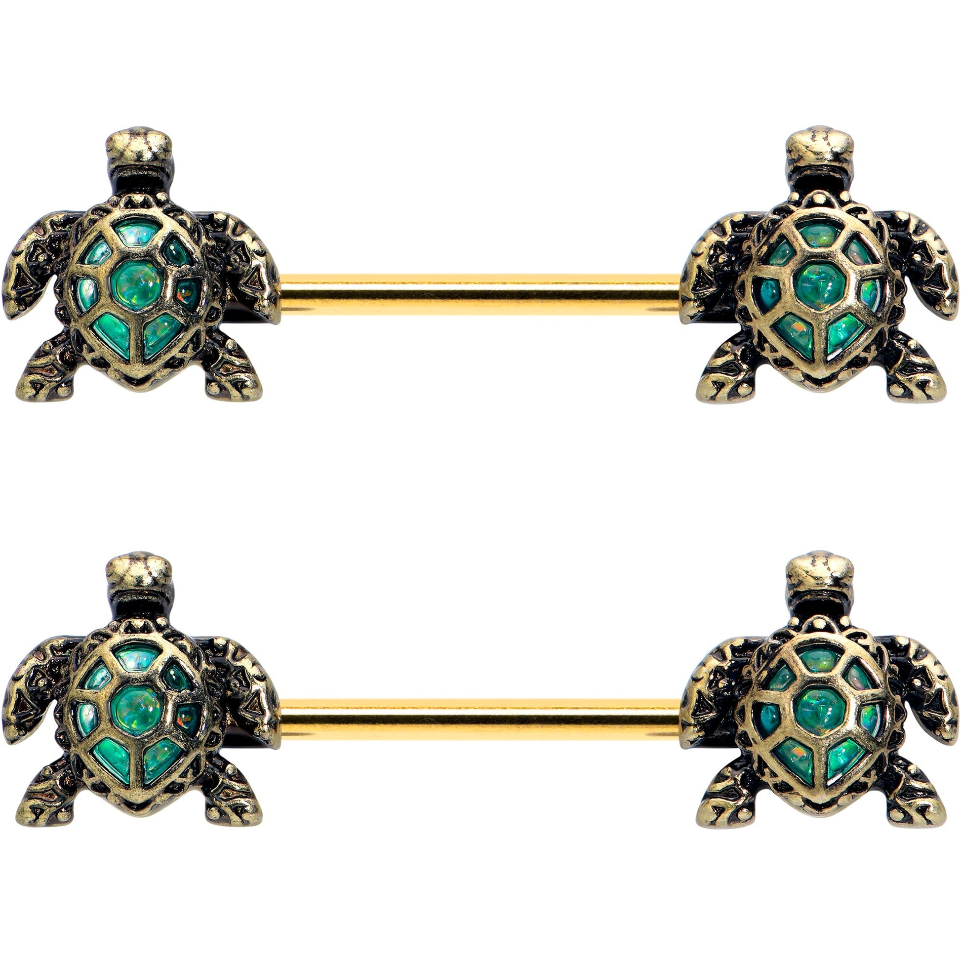 Show your love for your favorite ocean creature with this tribal influenced sea turtle nipple jewelry. It's made with 16mm gold tone anodized over 316L surgical grade stainless steel straight barbells. Each of the ends features a heavily embellished swimming turtle with green inlay embellishment on the shell. Don't let these stylish sea turtle nipple piercing rings swim away. Sold as a set of two.Specifications