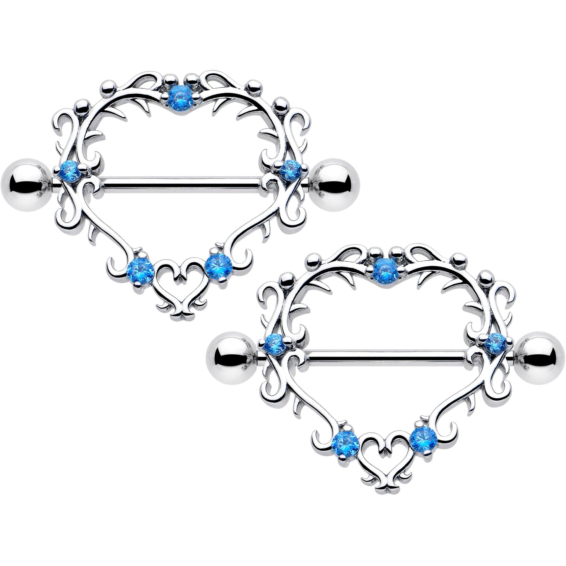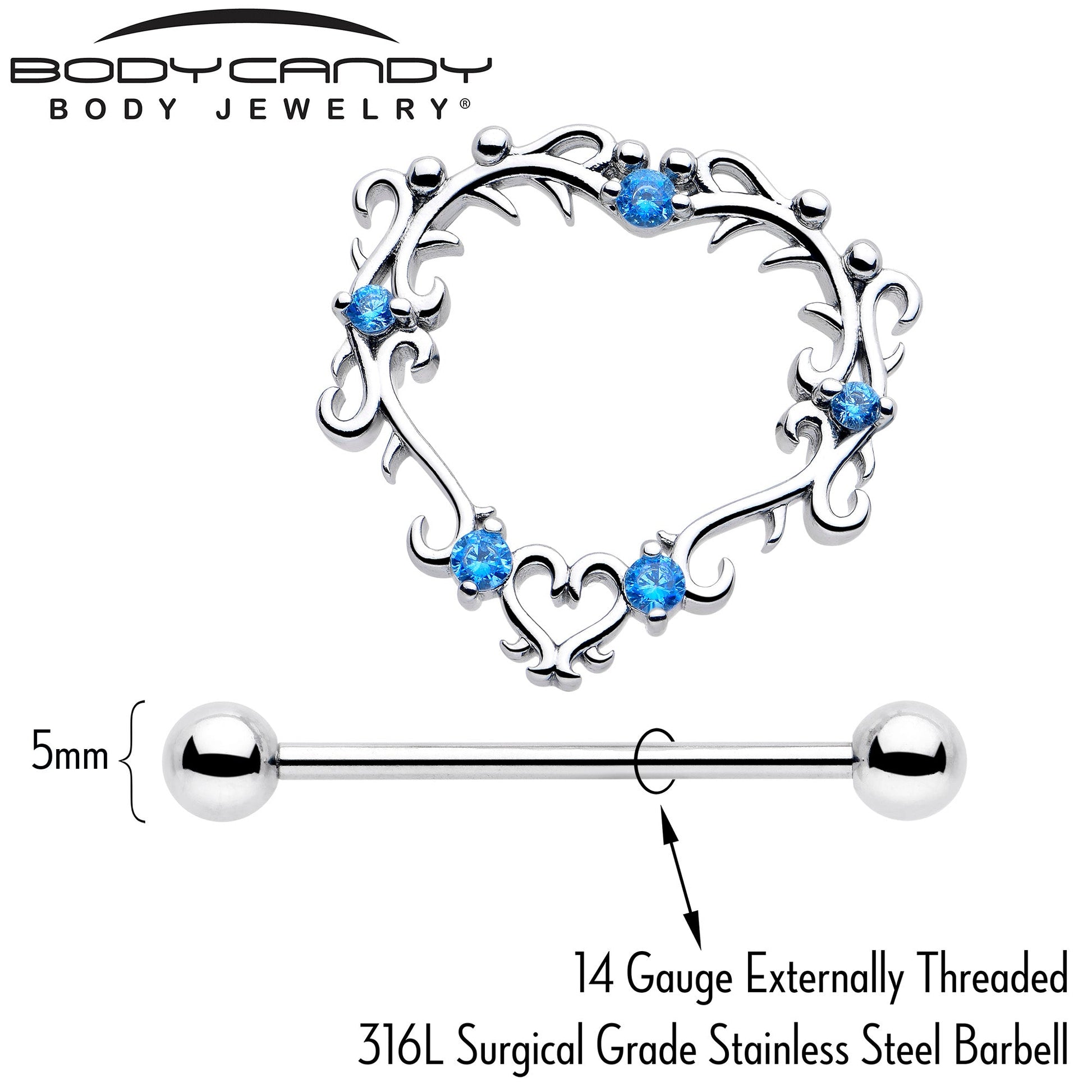 Get a look you'll never leaf behind with this 14 gauge nipple jewelry. It's made with 14mm durable 316L surgical grade stainless steel straight barbells with 5mm ball ends. The shield portions feature a leafy vine design that forms a large heart. The hearts are each embellished with textured ornamentation and blue cubic zirconia gems for a pop of color you'll love. These nipple piercing rings are sure to grow on you. Sold as a set of two.Specifications