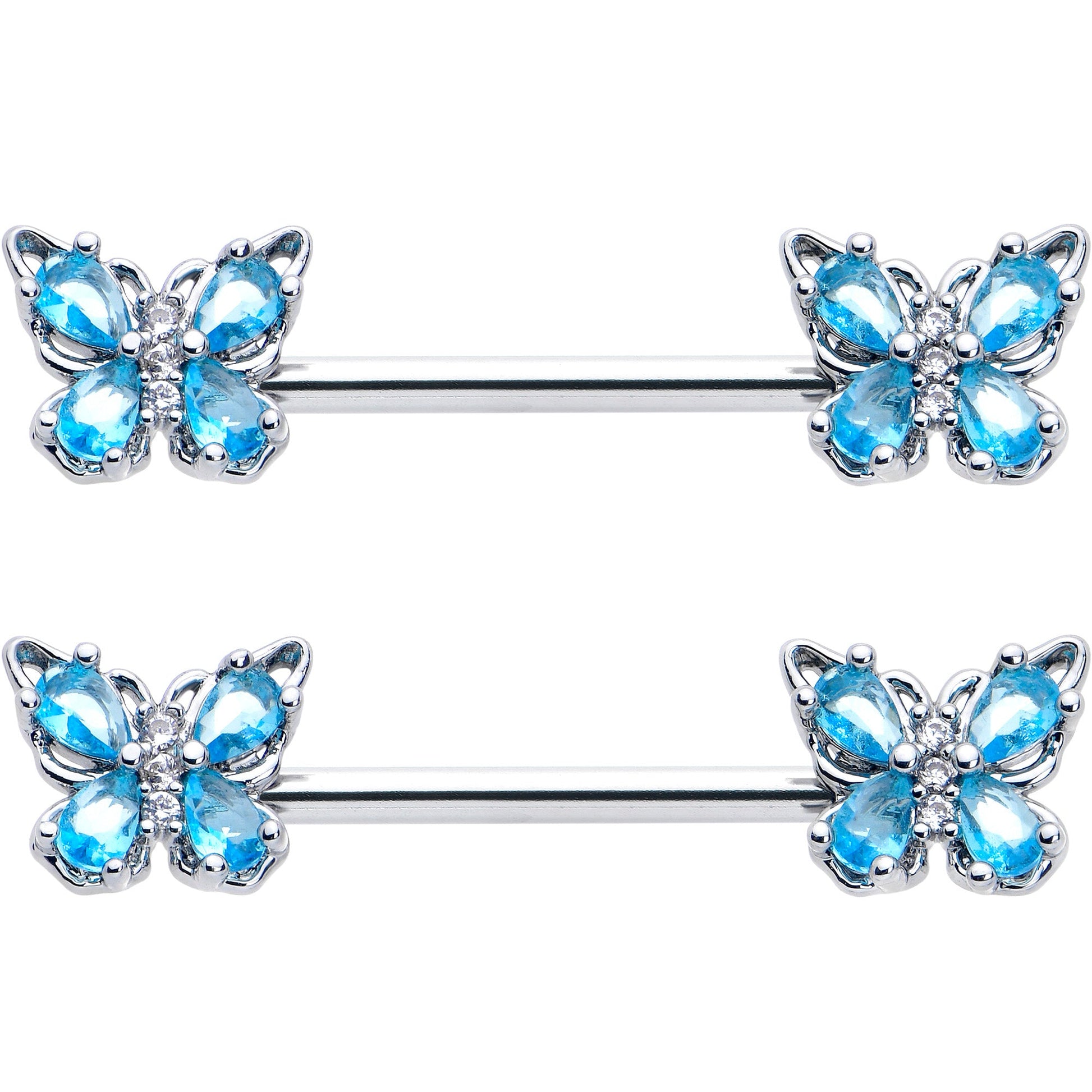 The butterfly on this 14 gauge nipple jewelry will make you want to go for baroque. It's made with 14mm durable 316L surgical grade stainless straight barbells. Each of the ends features a butterfly charm, with wings set with large blue gems. The butterflies are further embellished with clear gems for an ornate appearance. These opulent butterfly nipple piercing rings will make you want to fly. Sold as a set of two.Specifications