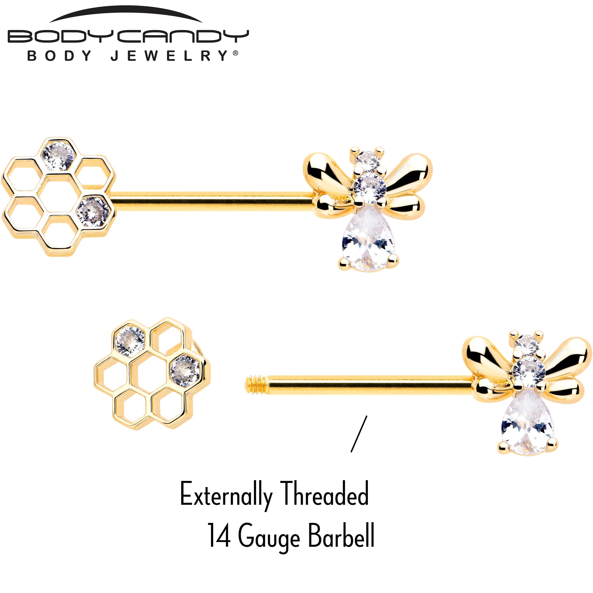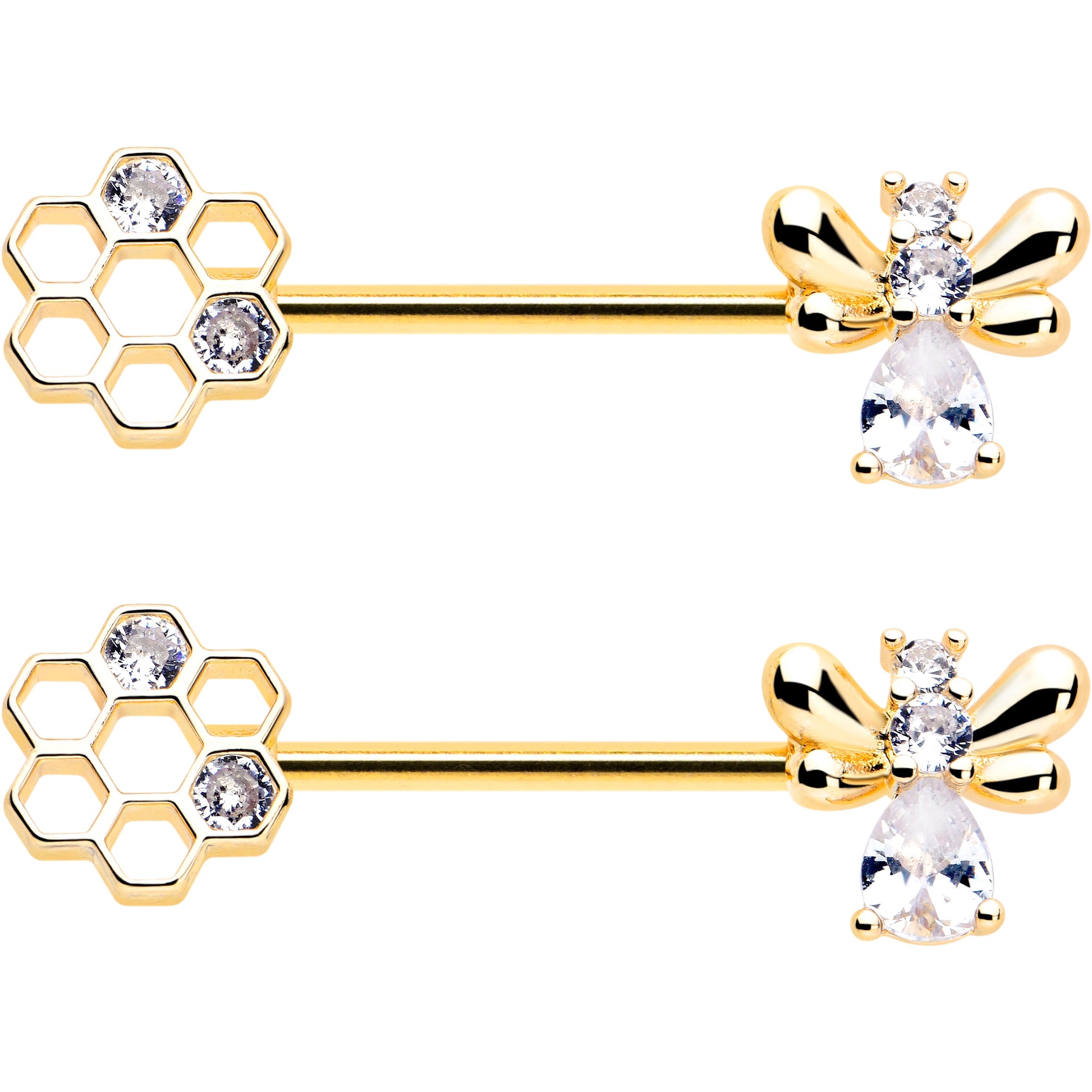 14G 9/16 Clear CZ Gem Gold Tone Bee Hive Luv Barbell Nipple Ring Set