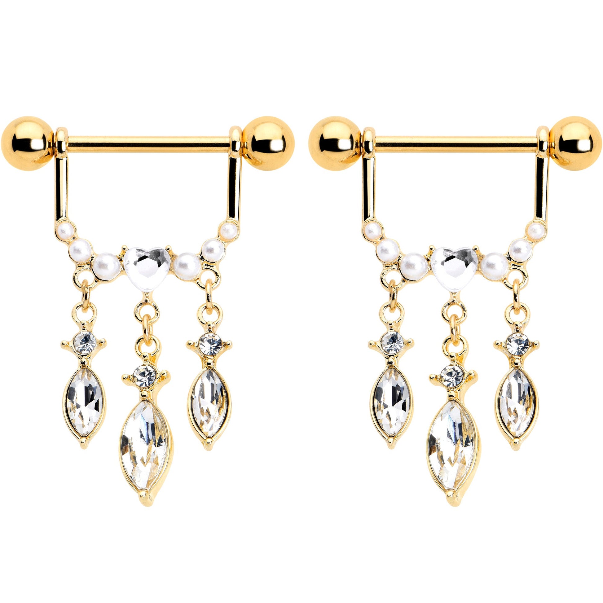 Triple the impact with this super luxe 14 gauge nipple jewelry. It's made with 14mm gold tone plated over 316L surgical grade stainless steel straight barbells with 5mm ball ends. Each one supports a row of of faux pearls with a clear gem heart in the center. Hanging beneath is a triple row of drop-shaped clear gem dangles. Turn up the volume on style with these ultra opulent nipple piercing rings. Sold as a set of two.Specifications