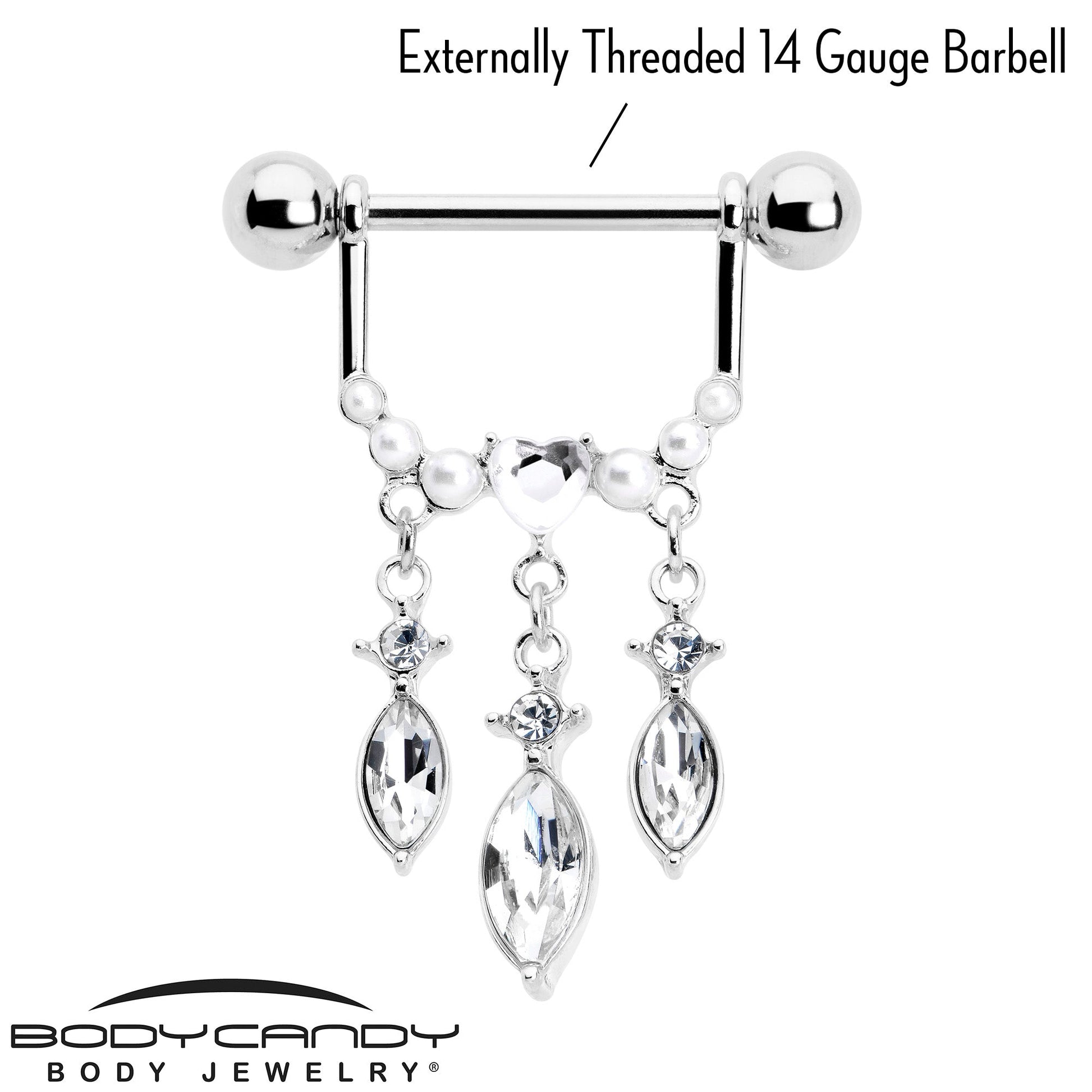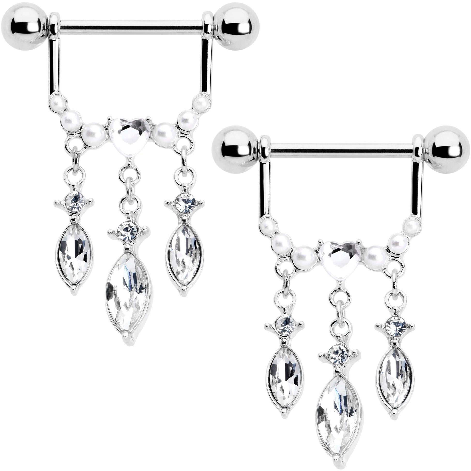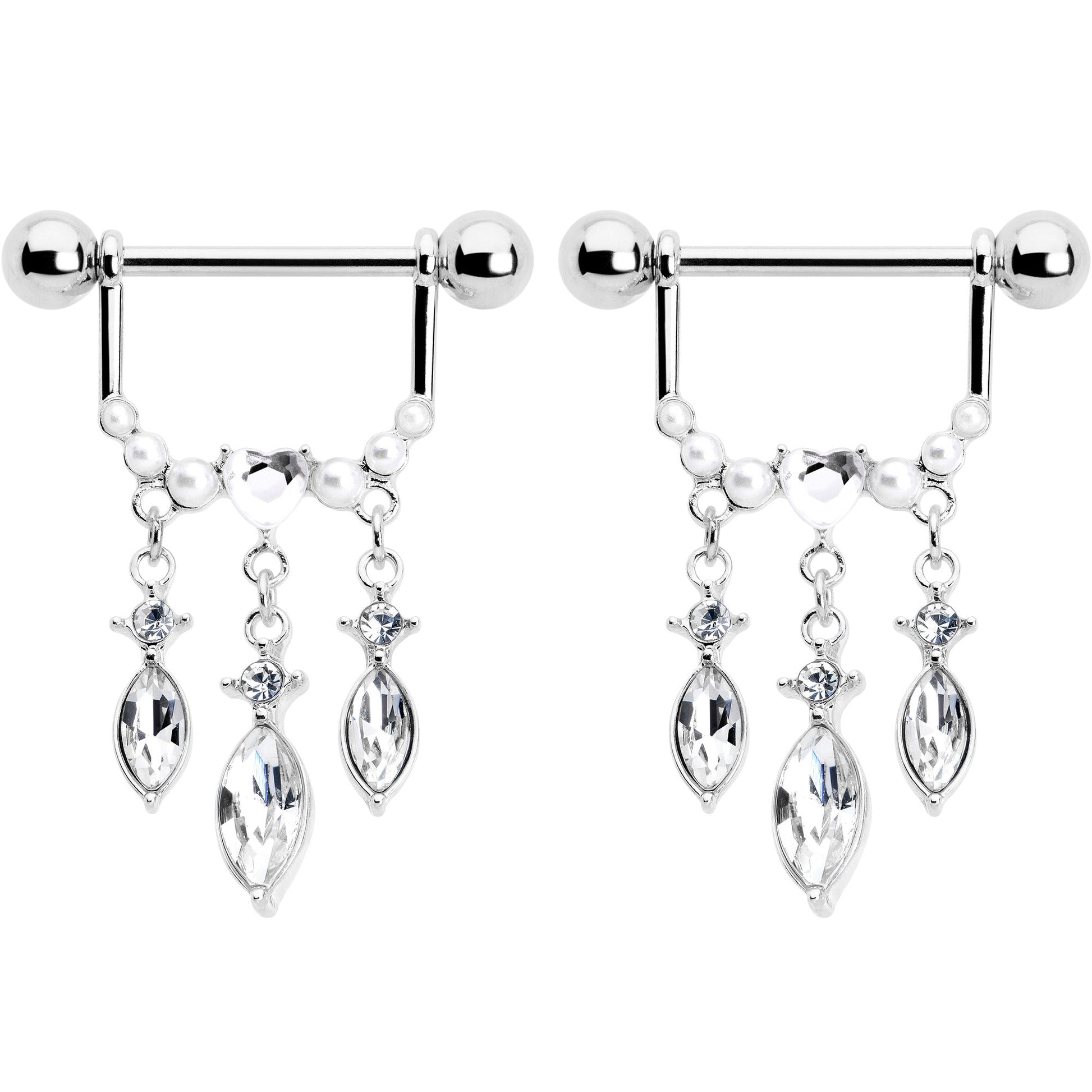 Triple the impact with this super luxe 14 gauge nipple jewelry. It's made with 14mm durable 316L surgical grade stainless steel straight barbells with 5mm ball ends. Each one supports a row of of faux pearls with a clear gem heart in the center. Hanging beneath is a triple row of drop-shaped clear gem dangles. Turn up the volume on style with these ultra opulent nipple piercing rings. Sold as a set of two.Specifications