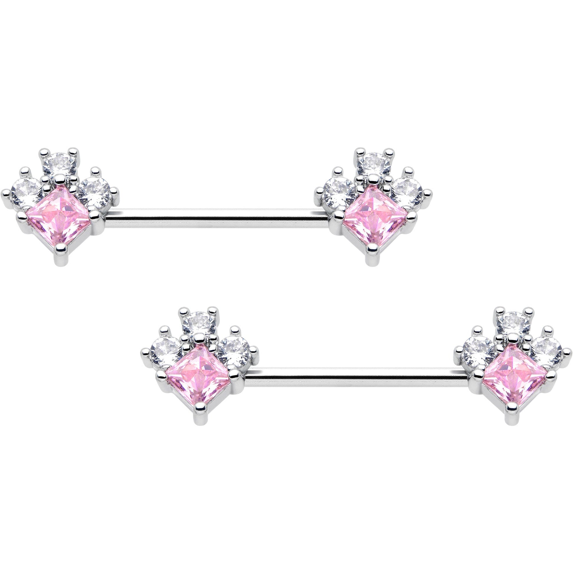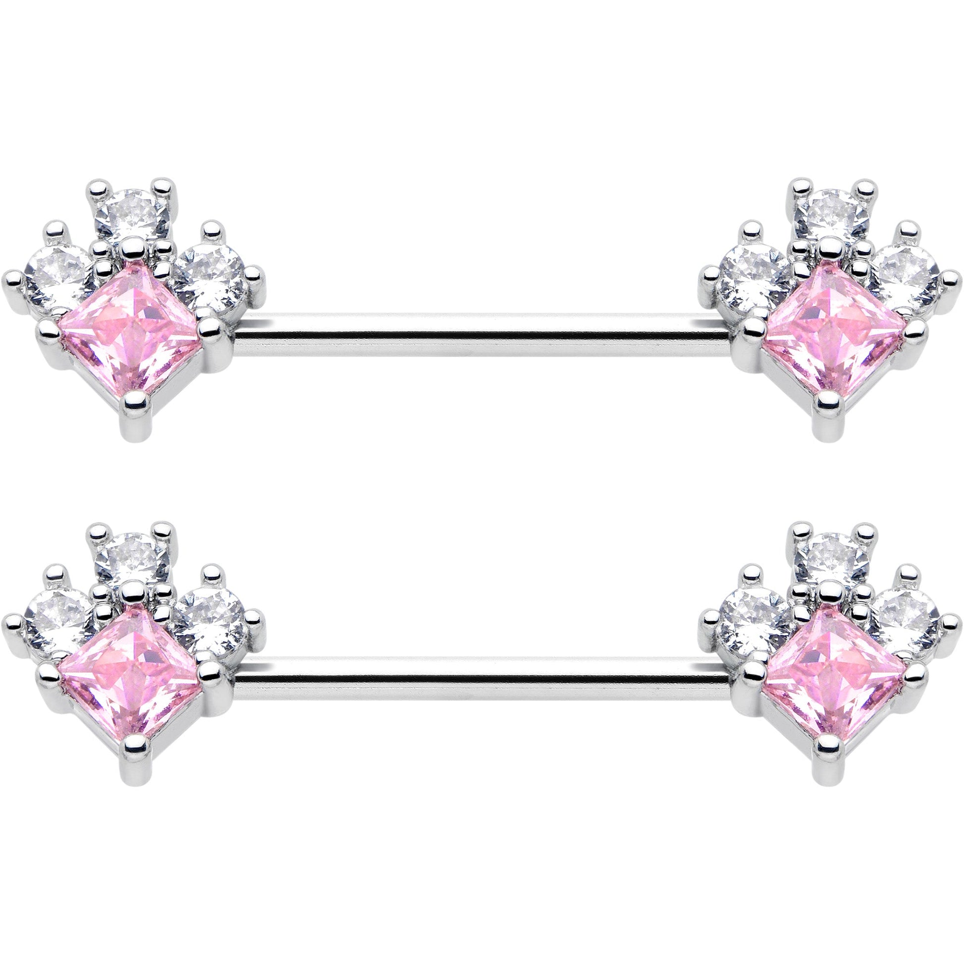Your look is sure to be a hit when you are rocking this 14 gauge nipple jewelry. It is made with 14mm durable 316L surgical grade stainless steel straight barbells. Each of the ends features an elegant rhombus charm, with pink cubic zirconia gem centers and trios of clear cubic zirconia gem embellishments for a color contrast you can not take your eyes off of. Make an impact with these elegant rhombus nipple piercing rings. Sold as a set of two.Specifications