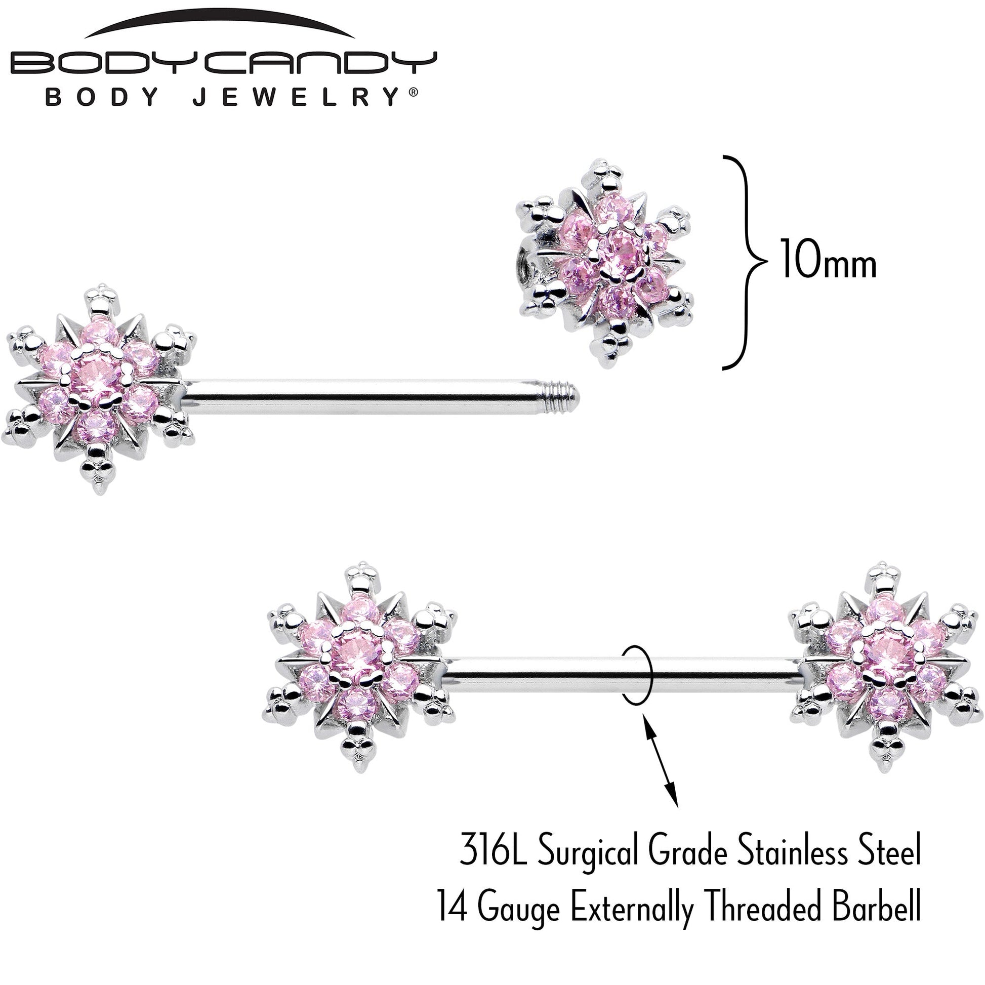 14G 9/16 Pink CZ Gem Snowflake Glam Barbell Nipple Ring Set