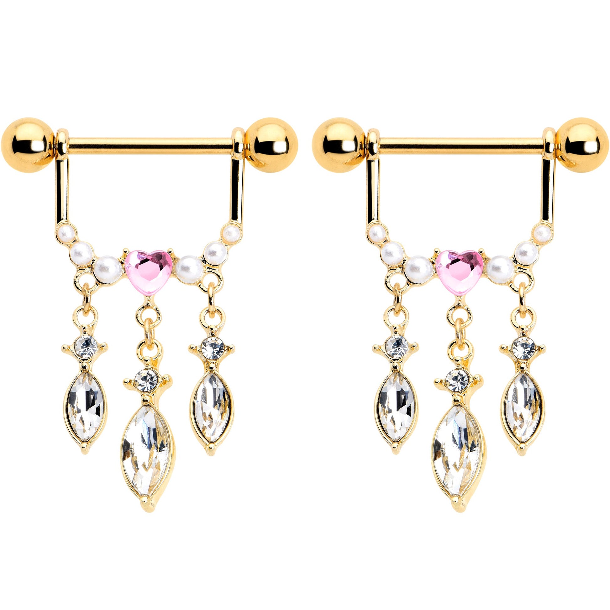 Triple the impact with this super luxe 14 gauge nipple jewelry. It's made with 14mm gold tone plated over 316L surgical grade stainless steel straight barbells with 5mm ball ends. Each one supports a row of of faux pearls with a pink gem heart in the center. Hanging beneath is a triple row of drop-shaped clear gem dangles. Turn up the volume on style with these ultra opulent nipple piercing rings. Sold as a set of two.Specifications