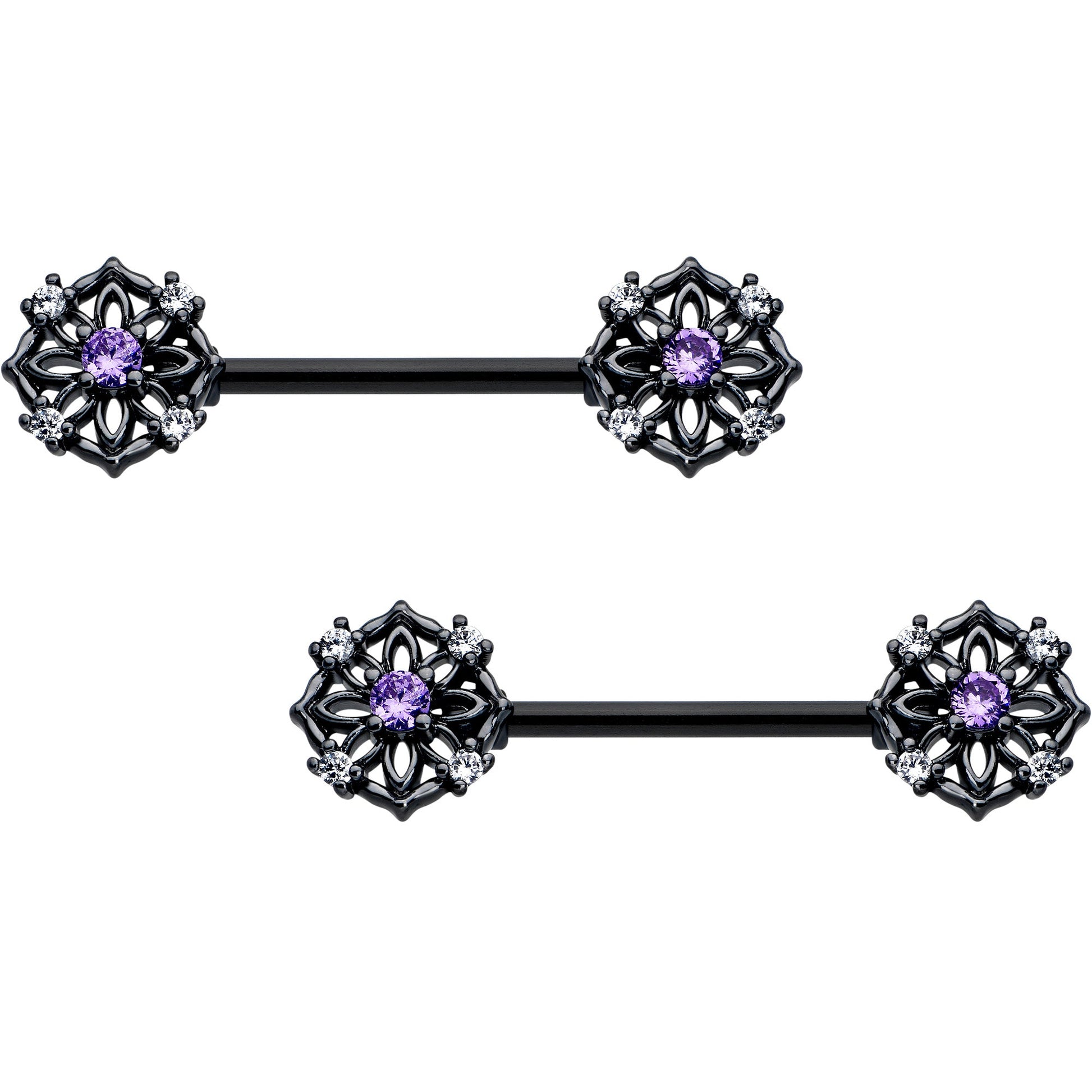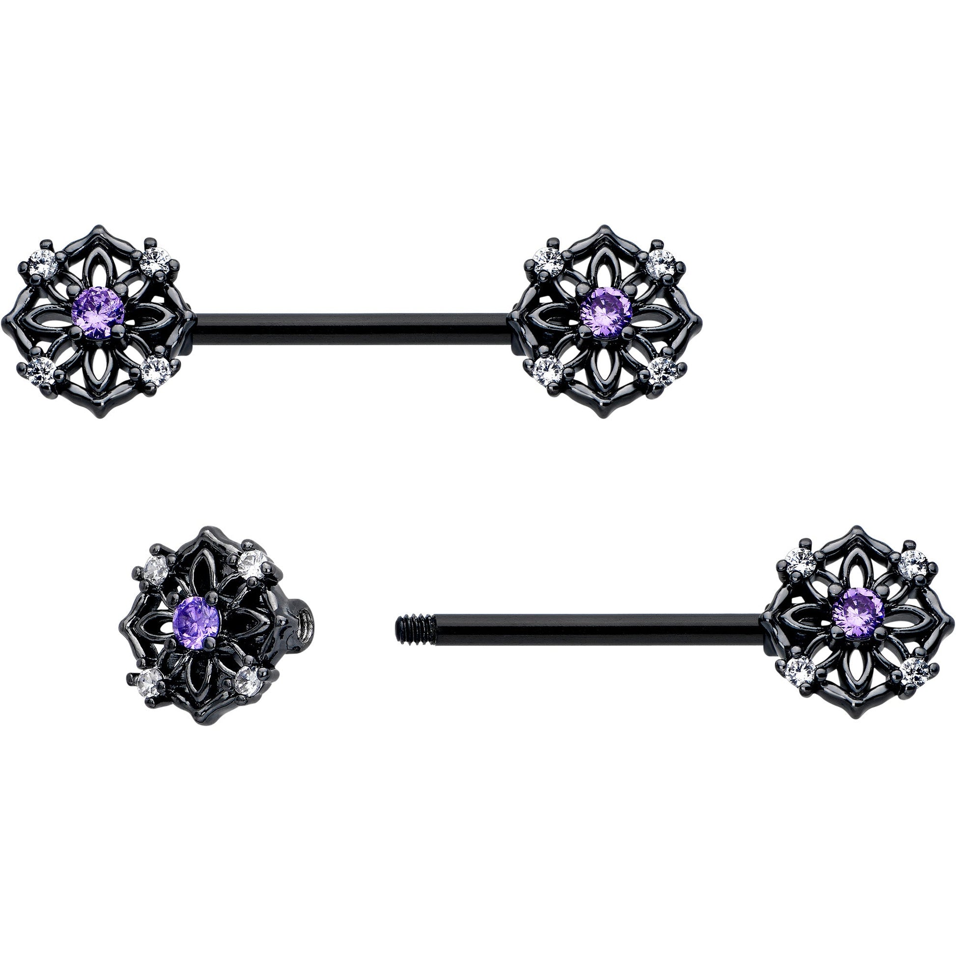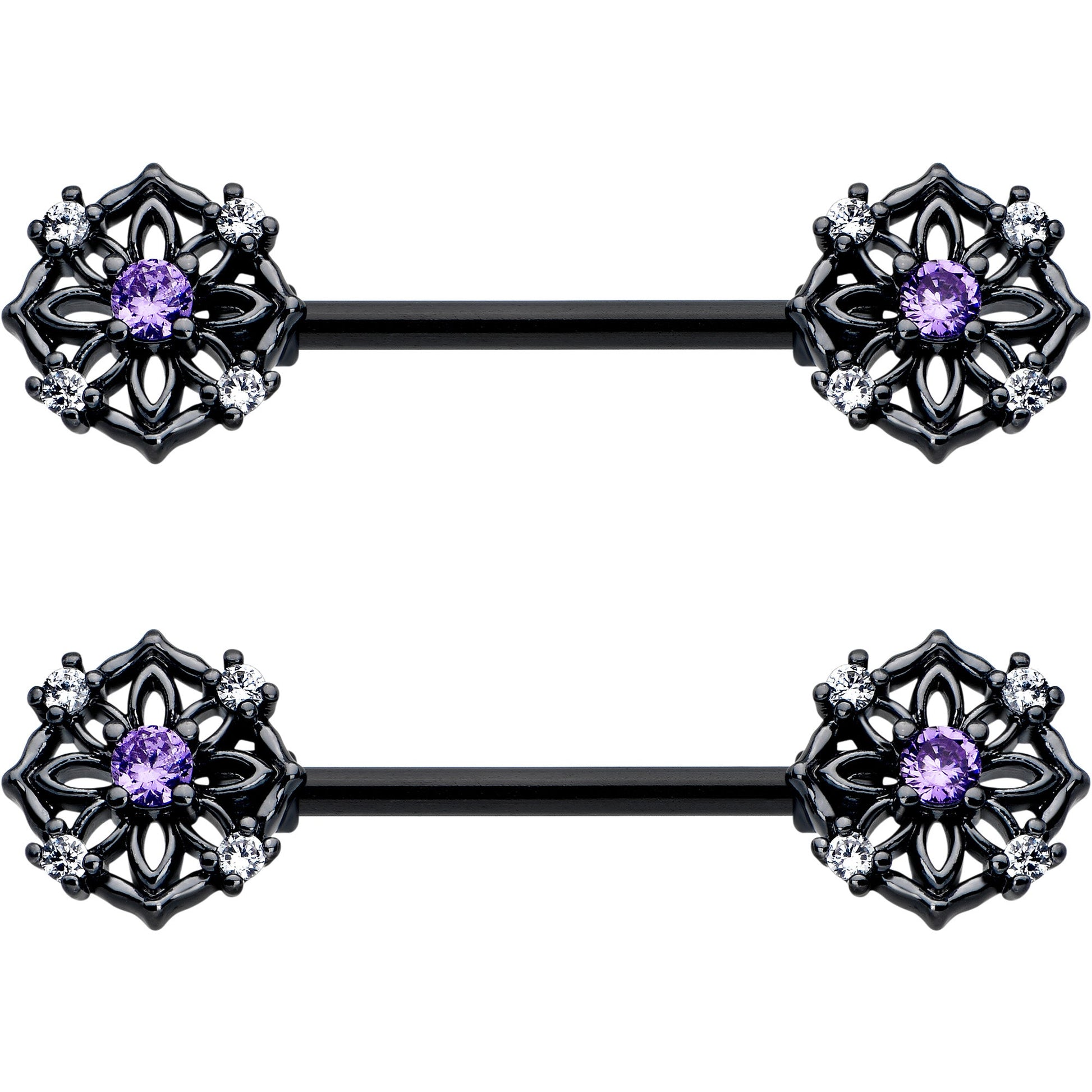 Your style will be blooming with this 14 gauge nipple jewelry. It's made with 14mm black PVD over 316L surgical grade stainless steel straight barbells. Each of the ends features a circular flower charm with openwork petals. The flowers are set with purple cubic zirconia gem centers and clear cubic zirconia gems along the outer edges. Let your look blossom with these fabulous floral nipple piercing rings. Sold as a set of two.Specifications