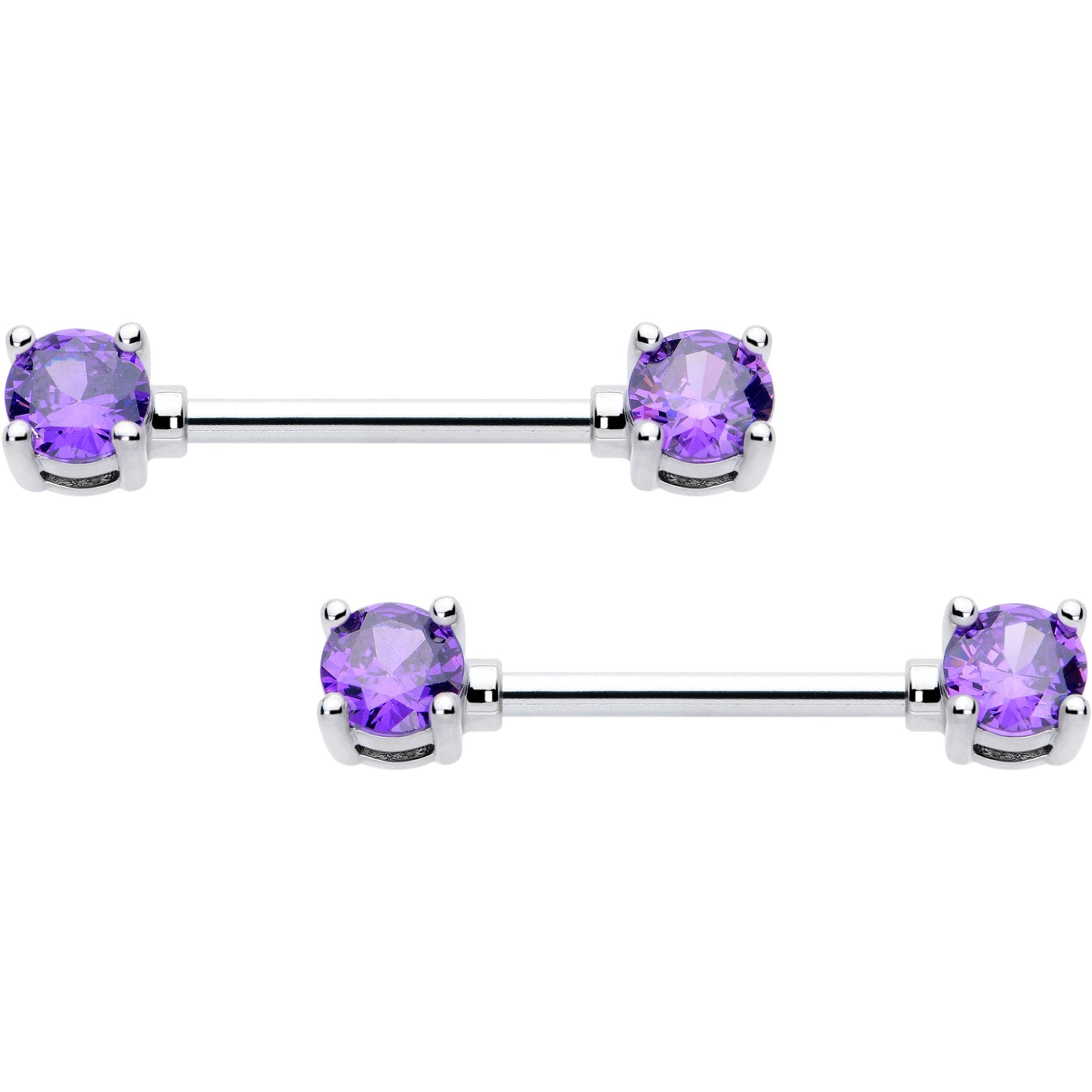 Party like it's your birthday all year long when you are rocking this 14 gauge nipple jewelry. It is made with 14mm durable 316L surgical grade stainless steel straight barbells. Each of the ends features forward facing purple cubic zirconia gems that emulate the birthstone for the month of February. Get festive and fabulous all year long with these charming nipple piercing rings. Sold as a set of two.Specifications