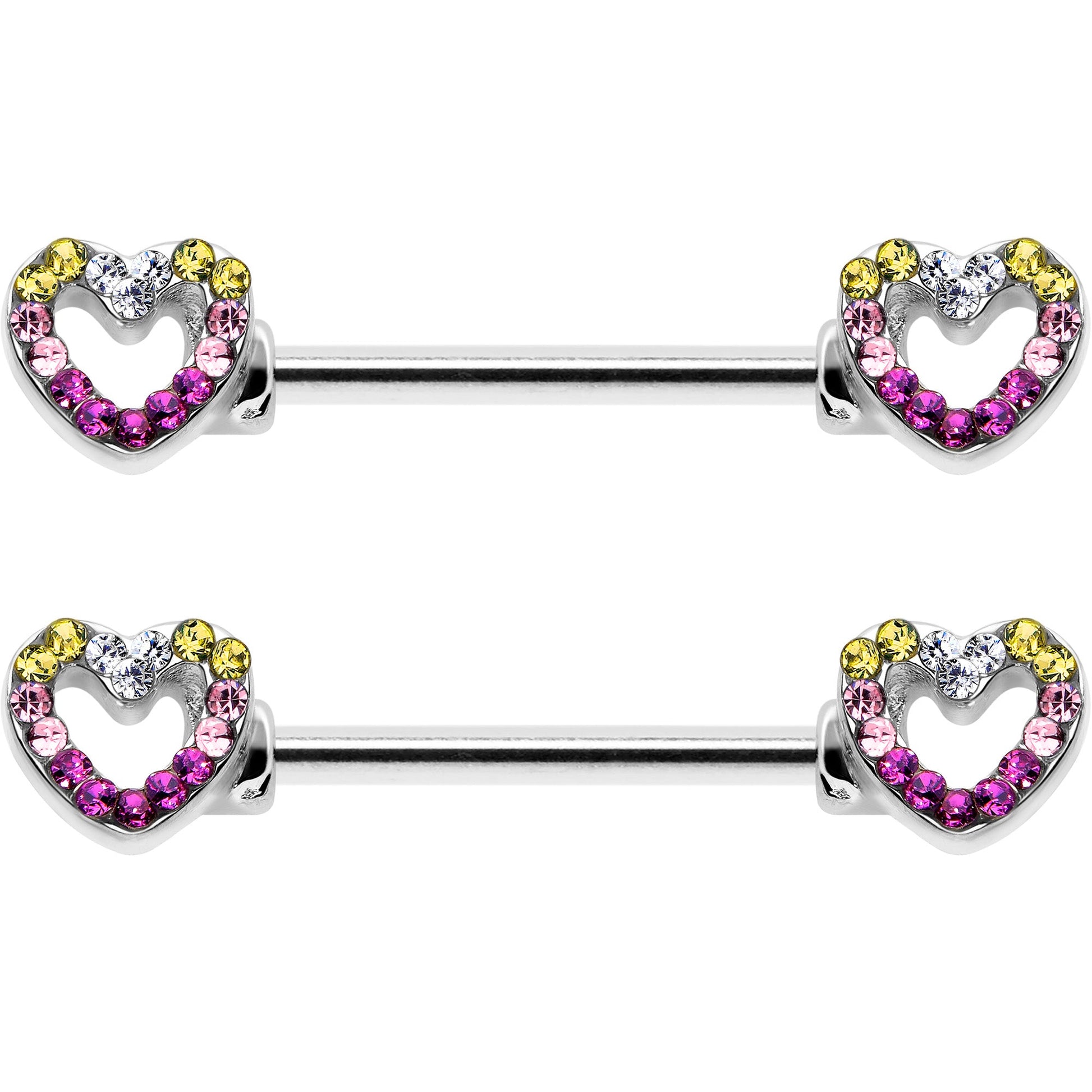 Love comes in all kinds of colors so keep your heart open and the world will notice - like on this 14 gauge nipple jewelry. It's made with 14mm durable 316L surgical grade stainless steel straight barbells. Each of the ends features a hollow heart charm, with the hearts paved with color gems. The hearts are open at the centers for an airy look. For the incurable romantic, these colorful valentine's nipple piercing rings are sure to make you fall in love. Sold as a set of two.