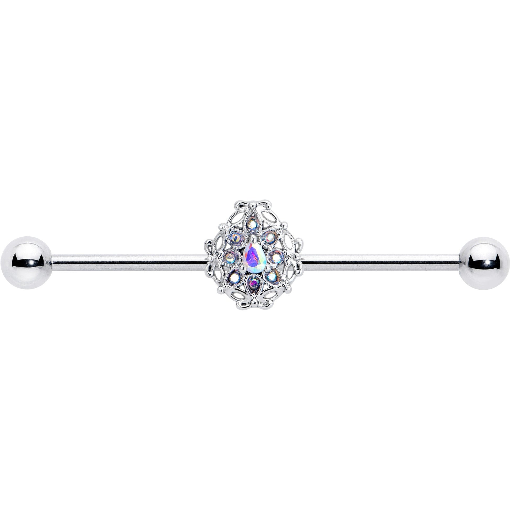 You may need to shield your eyes from the fierce glamour radiating from this 14 gauge helix barbell. It's made with a 1 1/2 inch 316L surgical grade stainless steel straight barbell with 5mm ball ends. It features an art-deco inspired cluster of small aurora gems around a large drop shaped aurora gem. The look is both simple and strikingly dramatic, and you can slide it up and down the length of the barbell for the perfect look. Take glamour to a whole new level with this alluringly opulent barbell earring.Specifications
