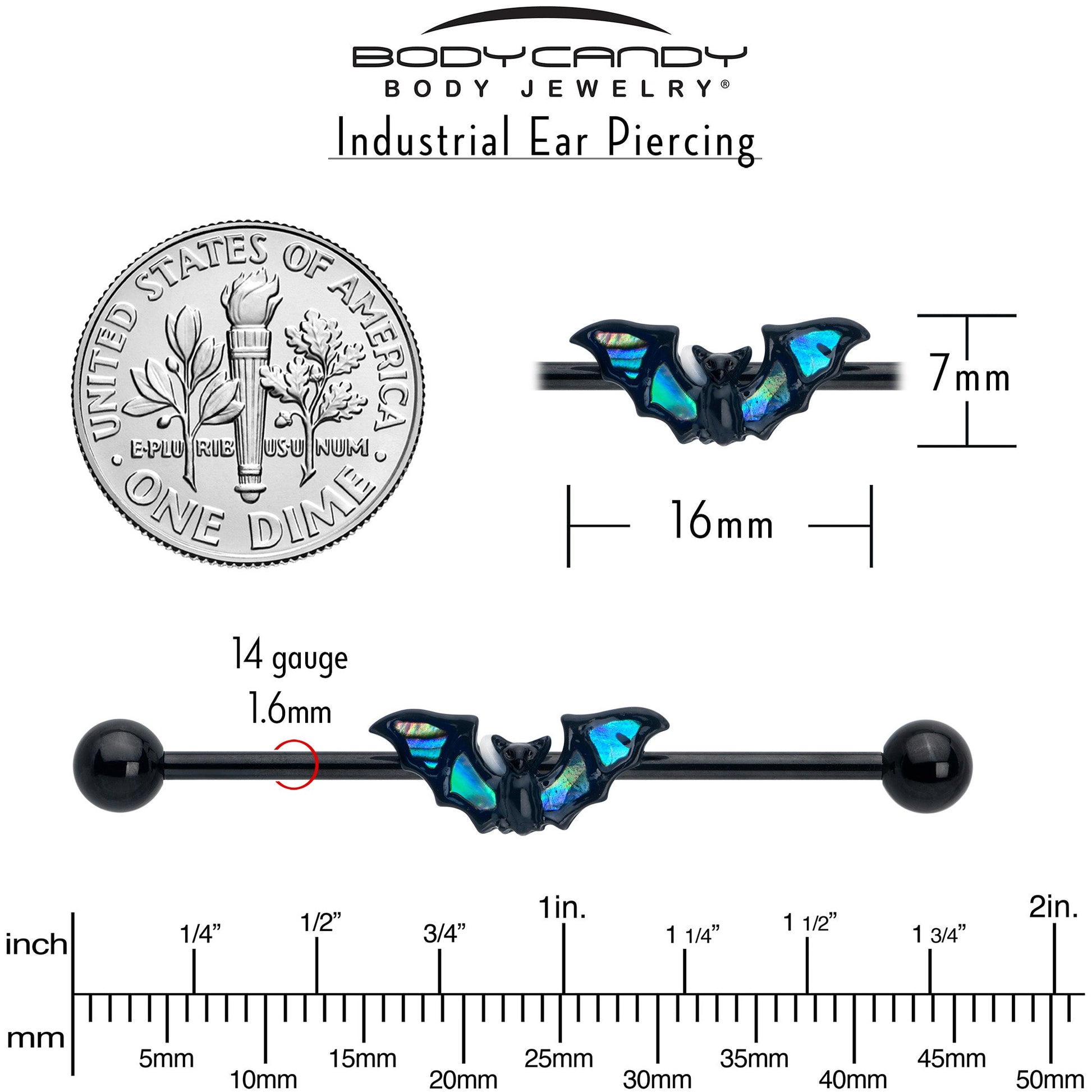 You would have to have bats in your belfrey not to fall in love with this 14 gauge bat-themed helix barbell. It is made with a 1 1/2 inch black anodized over 316L surgical grade stainless steel straight barbell with 5mm ball ends. It features a bat charm, set with subtle color embellishment in the wings. You can even slide it up and down the length of the barbell for the perfect look. You will want this bat barbell earring hanging around all year round.Specifications
