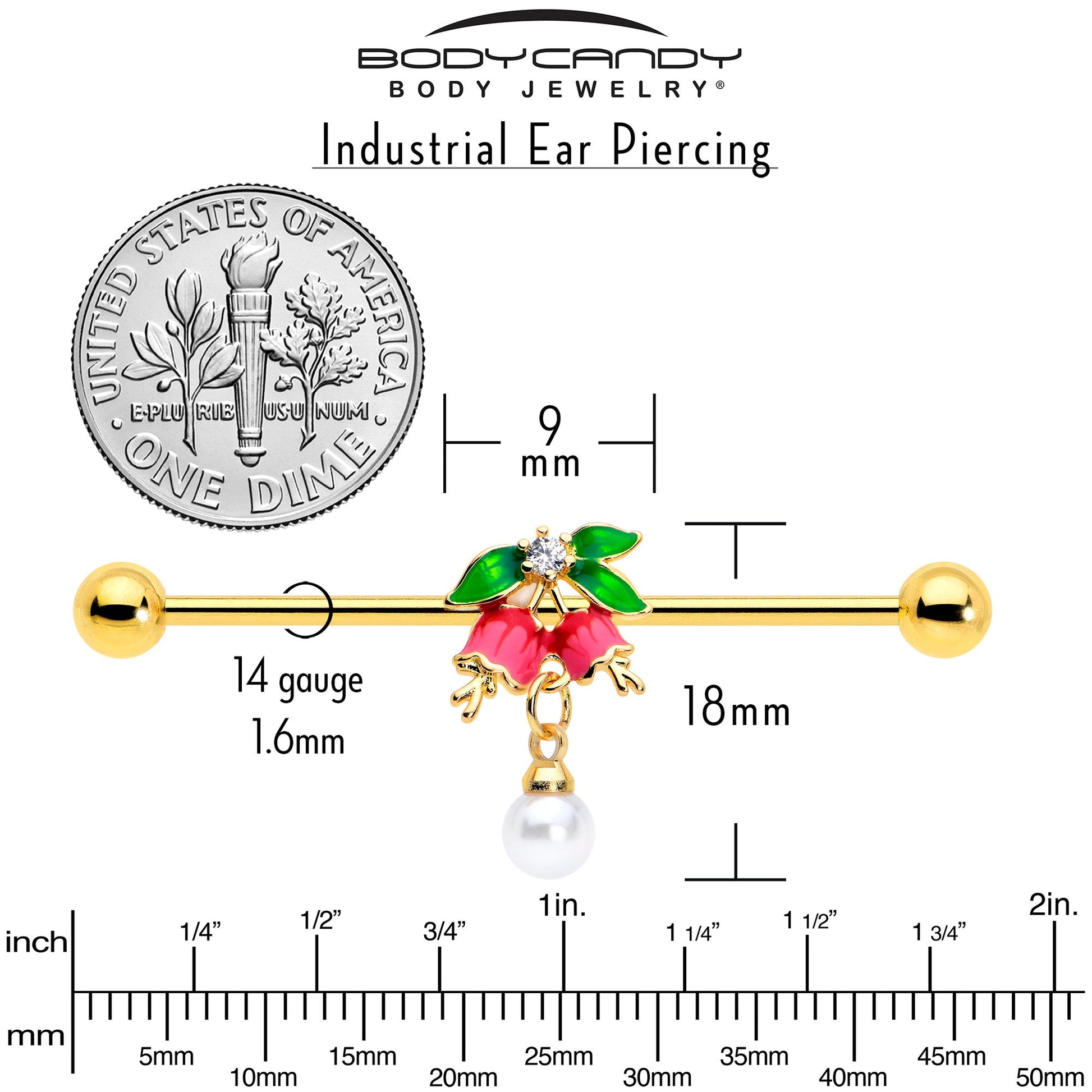 The flowers on this 14 gauge helix barbell are sure to ring your bell. It's made with a 1 1/2 inch gold tone PVD over 316L surgical grade stainless steel straight barbell with 5mm ball ends. It features a red and pink flowers charm with matching detailing. At the base of the flowers is a trio of green leaves with a clear cubic zirconia gem at the center. Dangling from the flowers is a faux pearl for added motion and style and you can even slide it up and down the length of the barbell for the perfect look. You'll be ready to make some noise when you're rocking these fashionable, floral barbell earring.Specifications