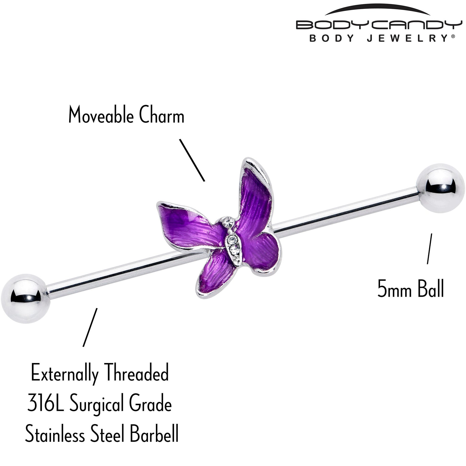 This 14 gauge helix barbell is not just a beauty, it is a beautiful butterfly. It is made with a 1 1/2 inch 316L surgical grade stainless steel straight barbell with 5mm ball ends. It features an elegantly simple butterfly charm, with purple wings and clear gems set into the body. You can even slide it up and down the length of the barbell for the perfect look. Simple details, style, and plenty of elegance - this barbell earring really is a beauty.Specifications