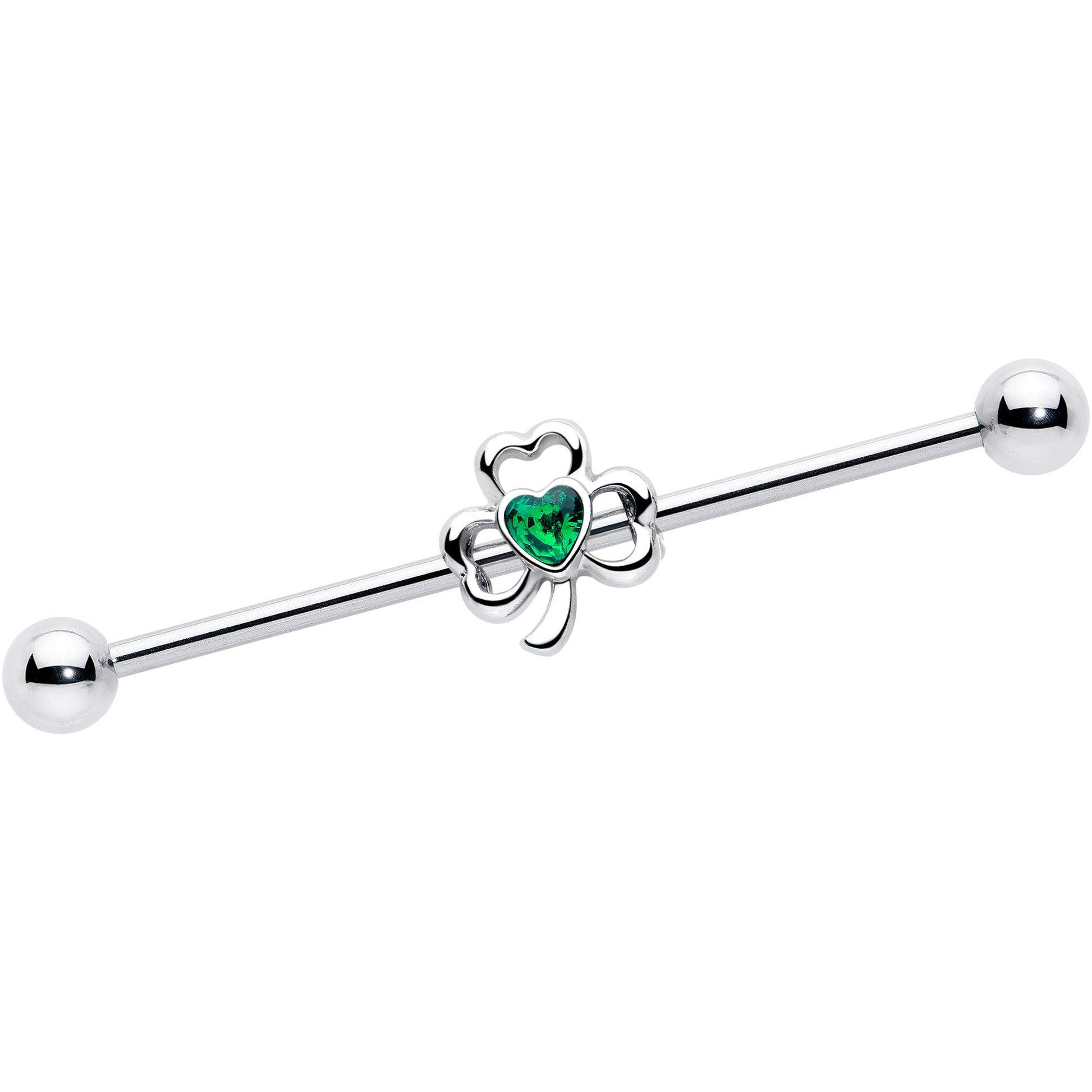 14 Gauge Green Gem Heart Shamrock St Patricks Day Industrial Barbell 38mm