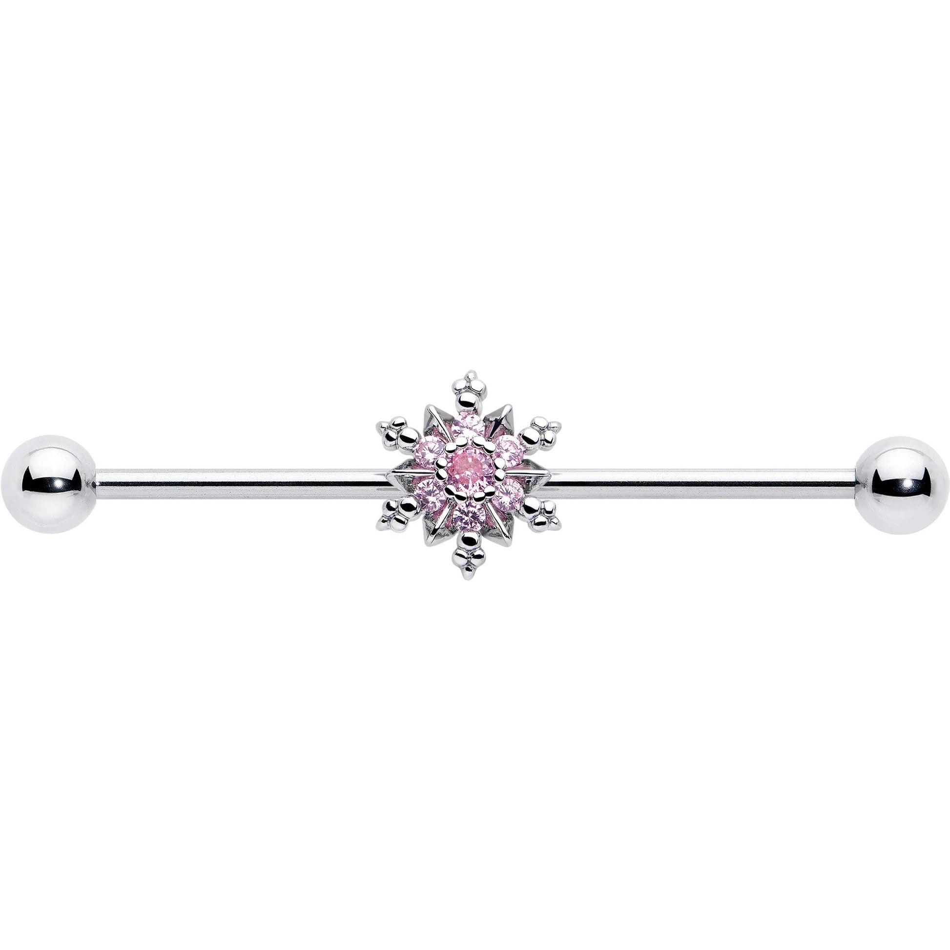 14 Gauge Pink CZ Gem Snowflake Glam Industrial Barbell 38mm