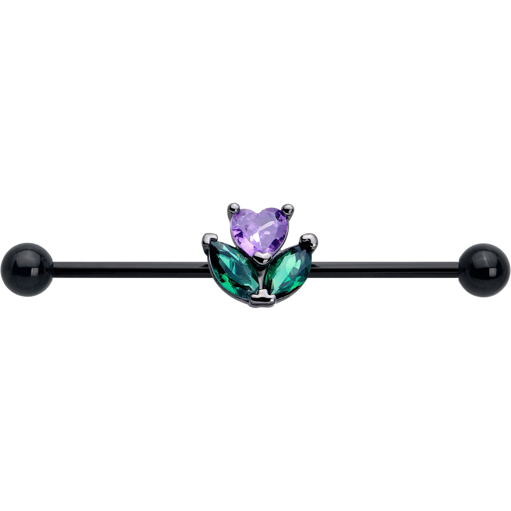 14G Purple Green CZ Gem Black Love Flower Industrial Barbell 38mm