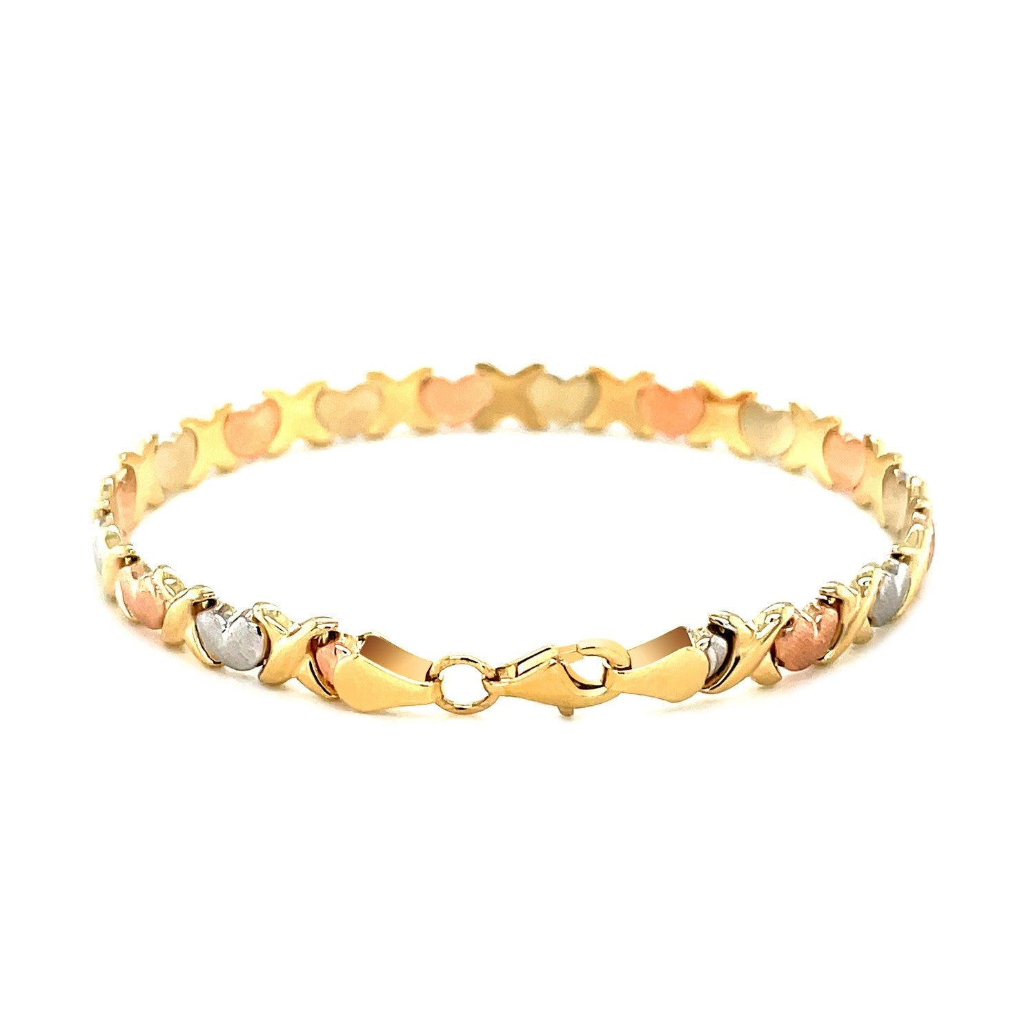 Kisses and hearts provide a romantic motif to this sentimental tri-color 14k gold bracelet. Soft satin hearts in white and rose gold alternate against the brightly polished yellow gold X motif links, providing a sweet kiss in between every heart. The perfect bracelet for the one you love, it measures 7 1/4 inches in length and is secured with a large lobster clasp.
