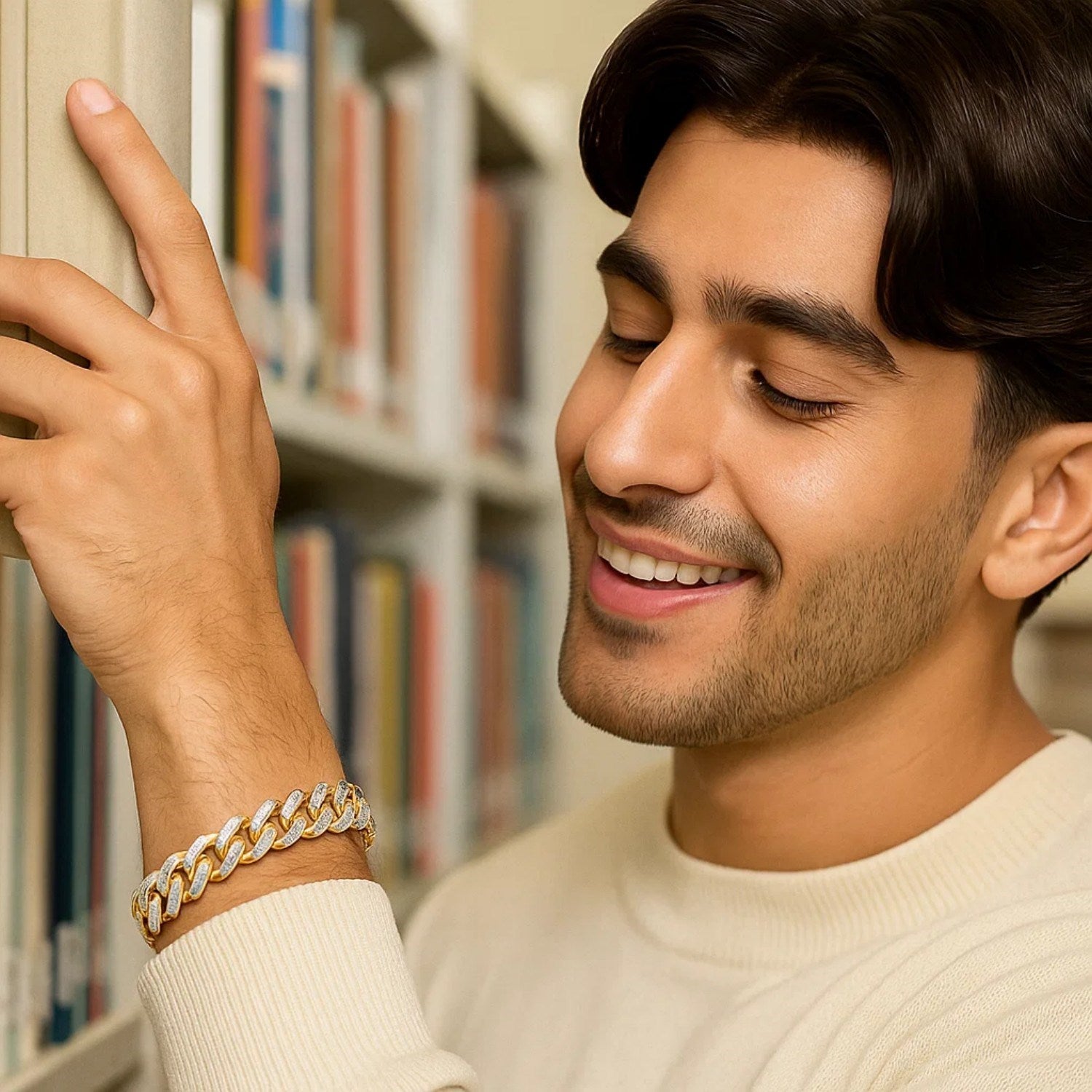Sparkling white pave texture adds light and sparkling color to this exquisite 14k two-toned gold bracelet. Bracelet is 8 1/2 inches long, 11.5mm wide, and closes with a box clasp.