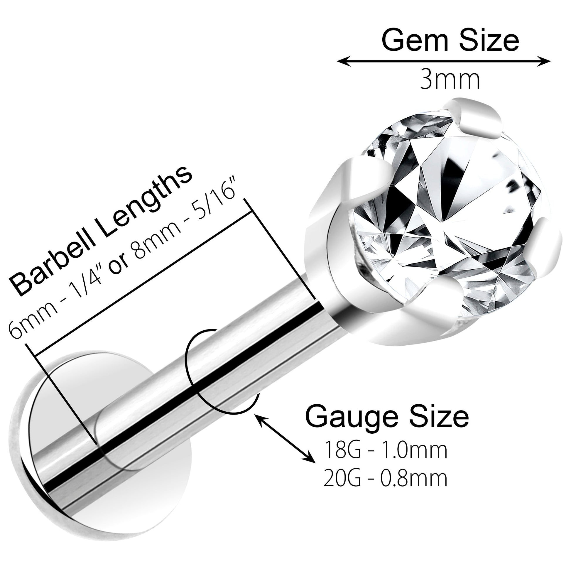 Available in 18 Gauge (1mm) and 20 Gauge (0.8mm) with length selections of 5/16" (8mm) or 1/4" (6mm) Post, Solid 14k Gold, Threadless Push In Flatback, 3mm Cubic Zirconia, Prong Setting, Handmade in the USA