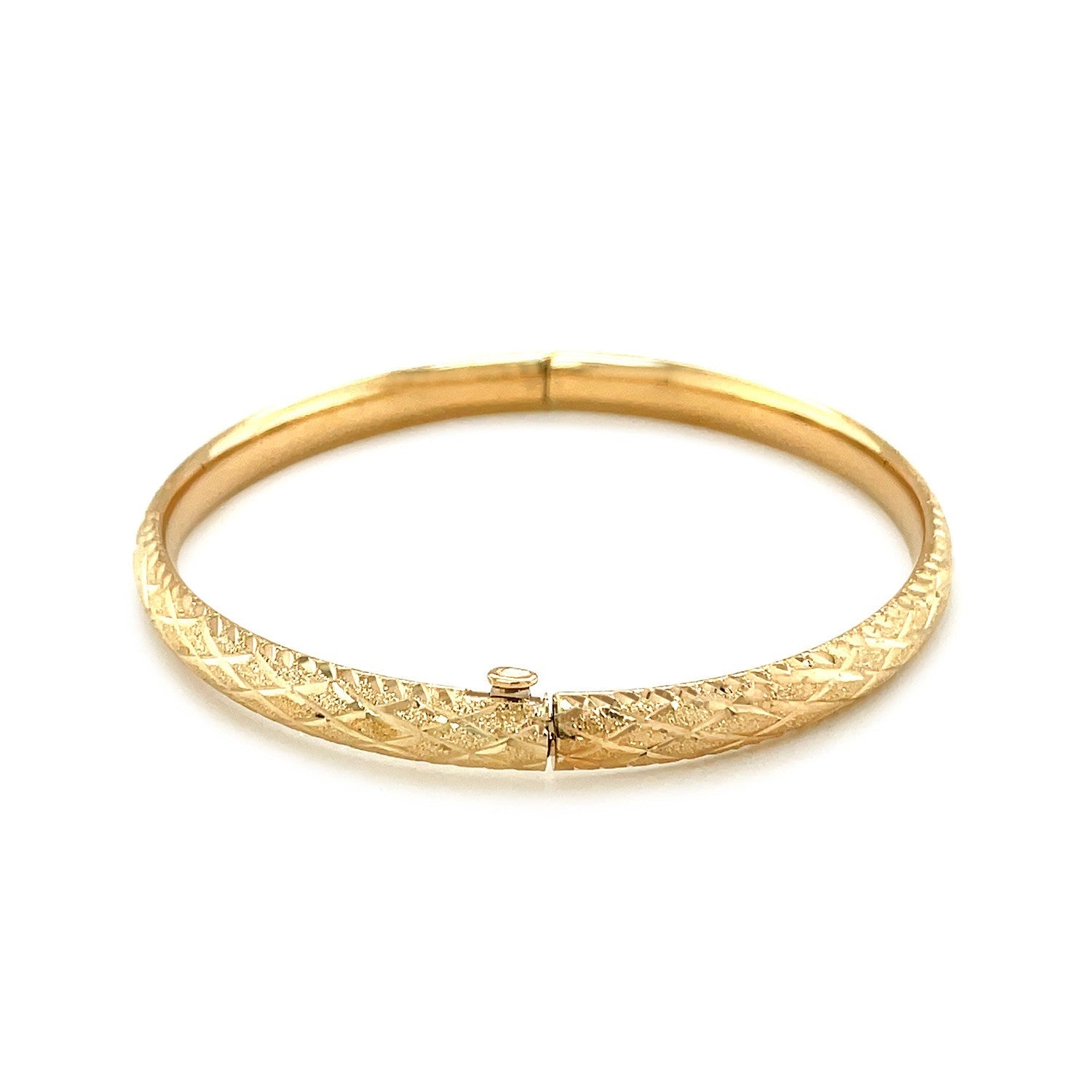 Weave motif diamond cuts highlight the beauty of this exquisitely crafted 14k yellow gold Childrens bangle. Comes with a side clasp and available in size 5 1/2 inches.