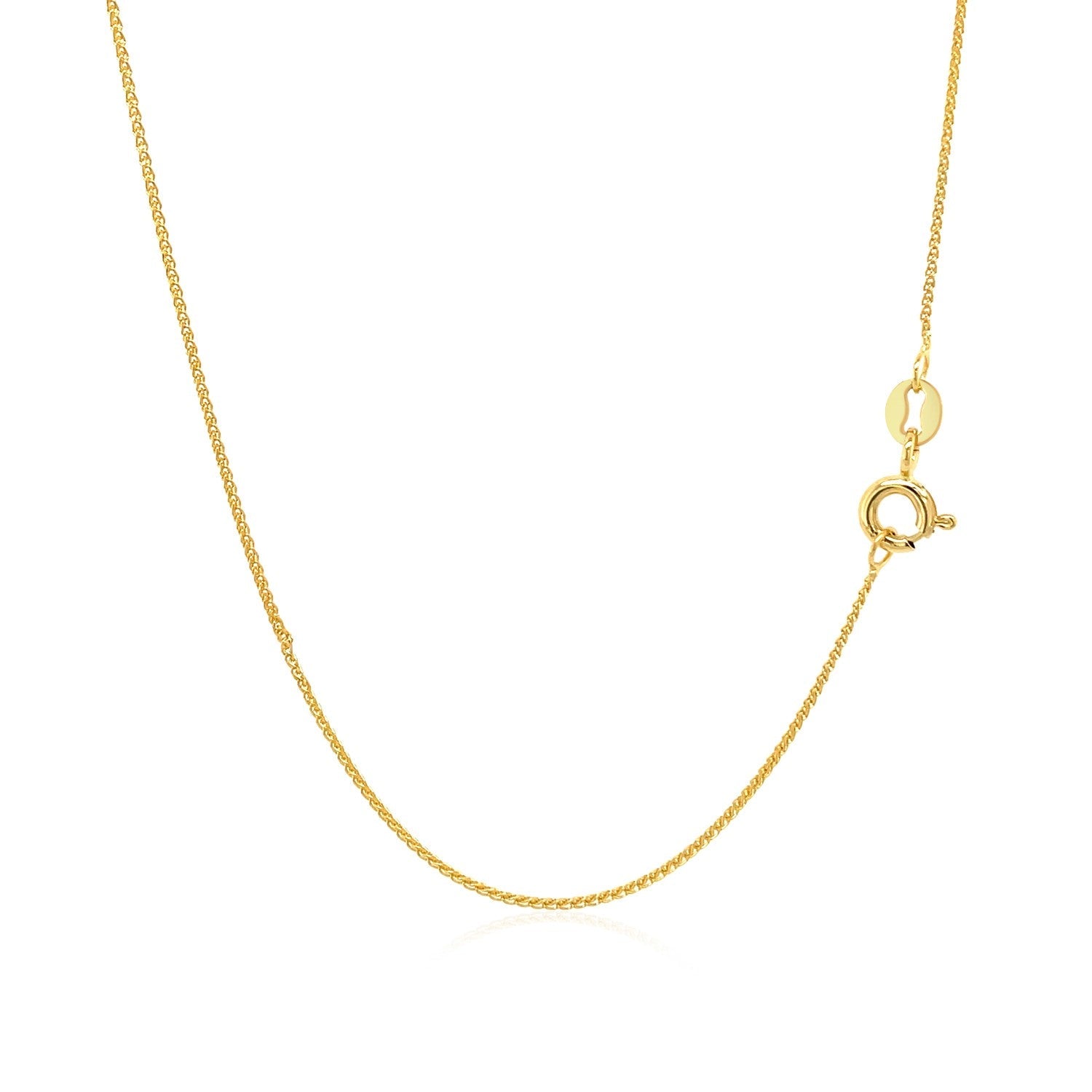 This diamond cut round wheat chain comes in 14k yellow gold and has a width of 0.60 millimeters.