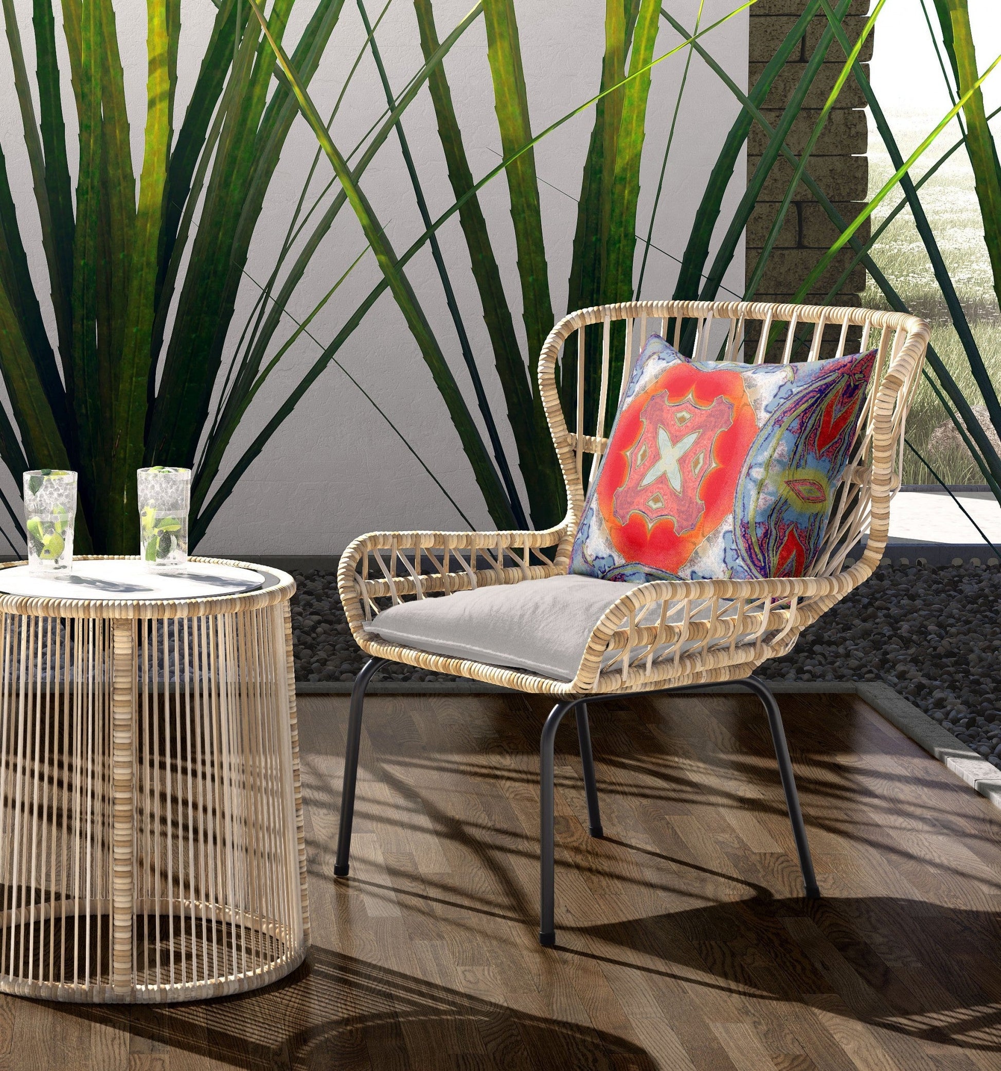 Highlight your living space with the vibrant colors of this Blue Orange Geo Tribal Indoor Outdoor Throw Pillow that strikes a perfect balance between cool and warm tones. The blue base resembles dried strokes of watercolor giving a sense of serenity to the piece while the circular center motif in vivid shades of orange creates a striking contrast adding a cheerful vibe to the pillow. Made with the finest broadcloth fabric, the pillow boasts longevity and sturdiness, ideal for both indoor and outdoor use. The plush look and fluffy nature come from the regular polyfill insert that provides a comfortable platform for your head and neck to maximize relaxation. If you want a bright pop of color in your modern home, opt for this exquisite throw pillow that harmonizes traditional tribal prints and exuberant colors to breathe life to your boho-chic ensemble. 16” x 16” x 5”