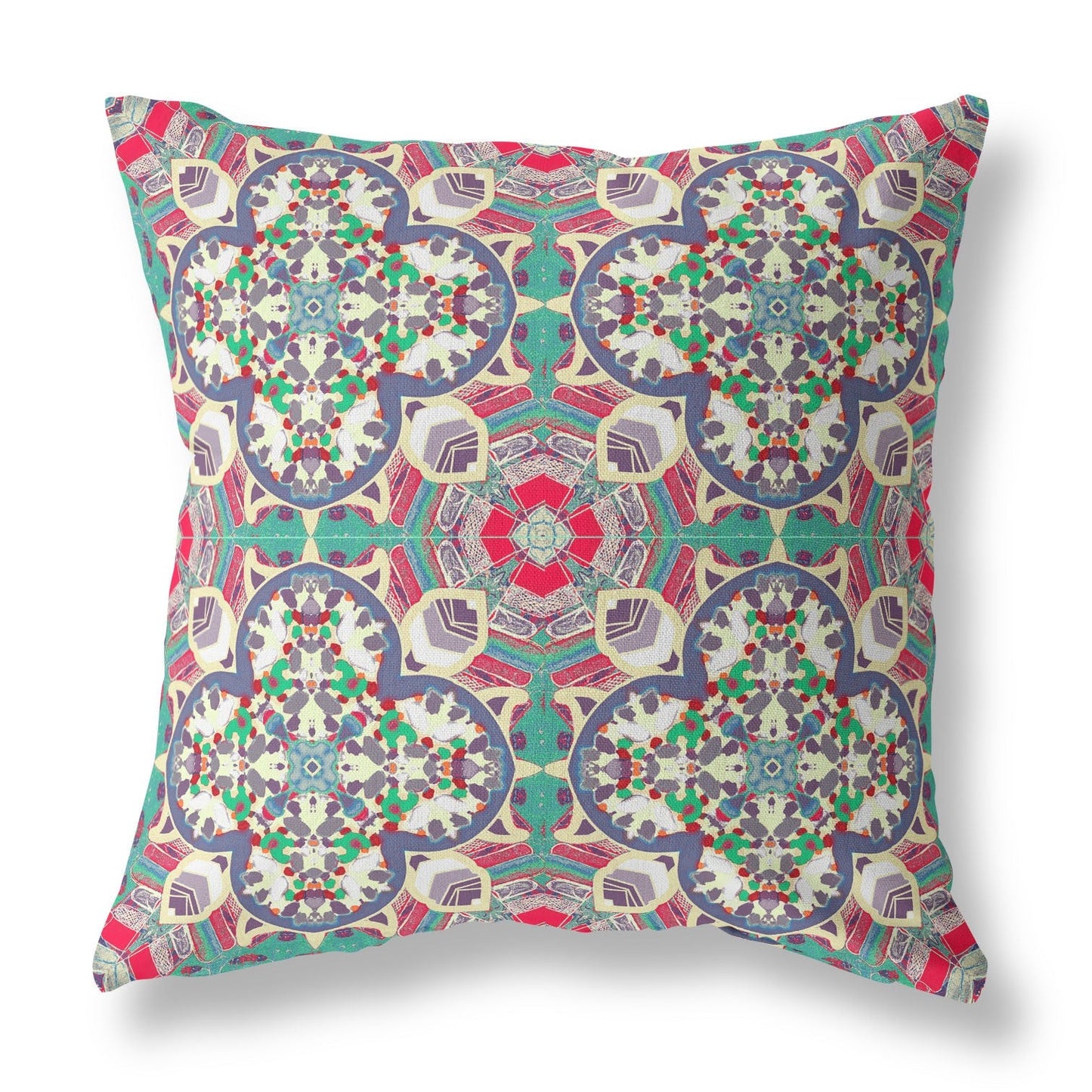 Invigorate your abode with the bright hues of this eye-catching Gray Pink Cloverleaf Indoor Outdoor Throw Pillow and watch your space become the bohemian nest you always dreamed of. The bright pink tones create a perfect harmony with the cool-toned gray, blue, and jade cool-on the rosette-like motif, making this throw pillow the essence of coastal bohemian flair. Ideal for indoors and out, this pillow is made from premium quality broadcloth fabric that is known for its durability to last long while the smooth and plush texture offers a characteristic sheen. With a polyester filling insert as soft as the clouds, the blown and closed pillow is perfectly suited for you to rest your head on. Turn your home into the epitome of boho bravura with the pastel hues of this beautiful throw pillow. 16” x 16” x 5”