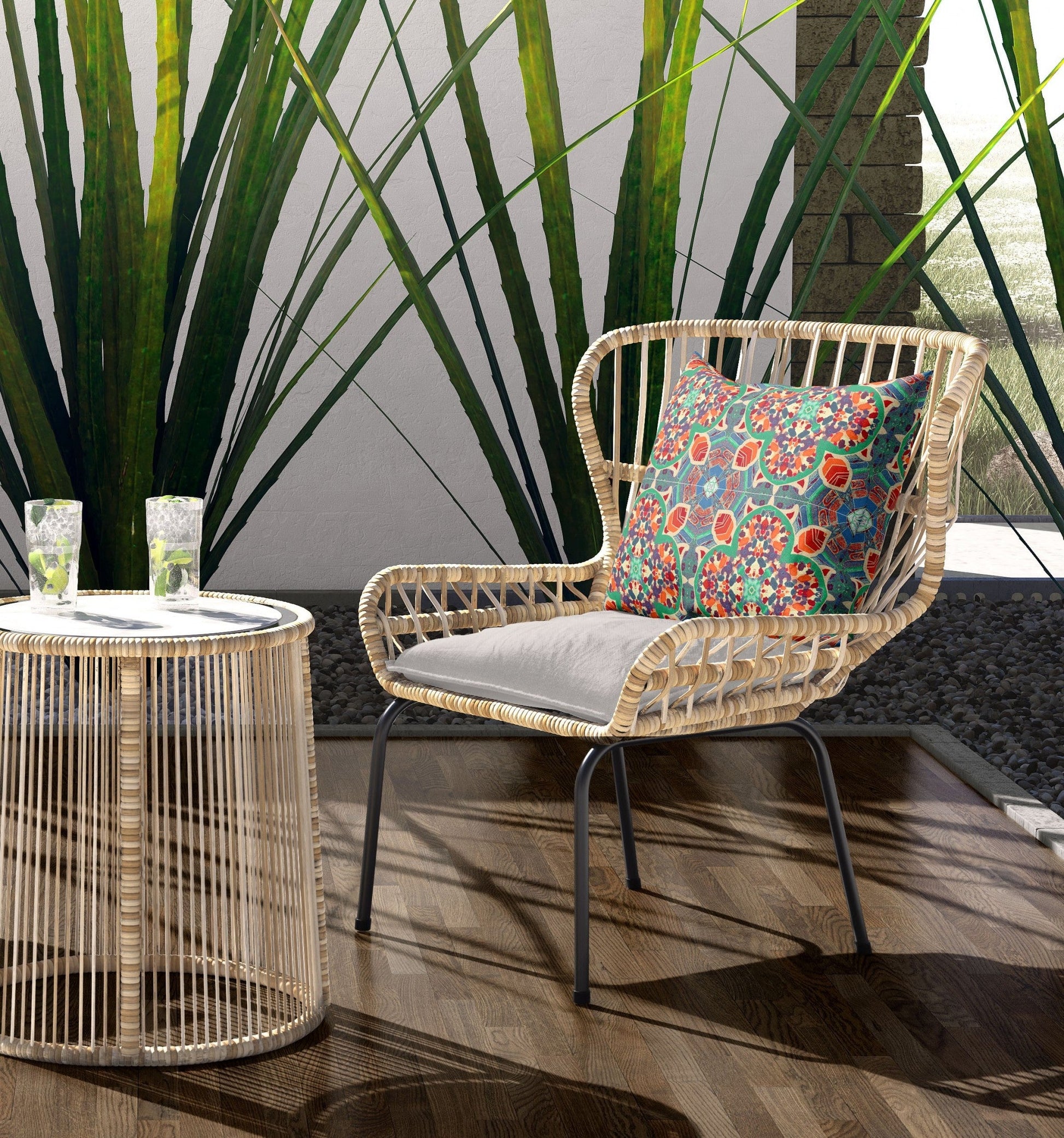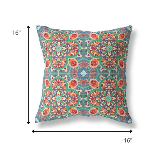 Enliven your living space with this stunning Orange Green Cloverleaf Indoor Outdoor Throw Pillow that features a palette of colorful hues to bring a bohemian essence to your home. The intriguing cloverleaf-like patterns exhibit vibrant shades of warm reds and oranges with cool blue and jade tones to strike a perfect balance. This blown pillow is crafted with topnotch broadcloth fabric, which is sturdy yet soft to the touch with a silky smooth surface texture, making it a great decorative and practical accent for indoor and outdoor settings. The soft and fluffy nature comes from the regular polyfill insert that provides a comfortable platform for your head and neck to maximize relaxation. Make your living space look and feel more welcoming with this beautiful decorative pillow that’s meant to add colors to your interior décor. 16” x 16” x 5”