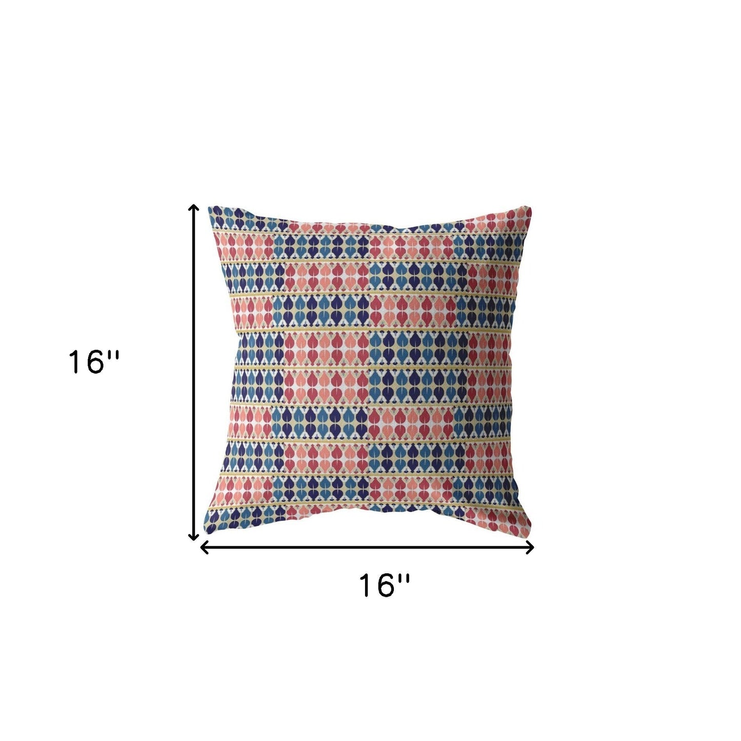 The vibrant colors and captivating pattern of this Red Blue Spades Indoor Outdoor Throw Pillow will create an eye-catching transitional aesthetic in your living room. The decorative pillow features a mesmerizing spade print in recurring patches of blue and red with gold accents that give it a modern edge. Crafted with a top-notch broadcloth fabric for a sturdy construction, the pillow is smooth to the touch while having durability for both indoor and outdoor usage. The blown and closed pillow has a soft and fluffy texture that can be attributed to its premium polyester insert. The trendy colors and patterns give this decorative pillow an elegant look while having a bohemian essence to perfectly complement modern and transitional décors. 16” x 16” x 5”