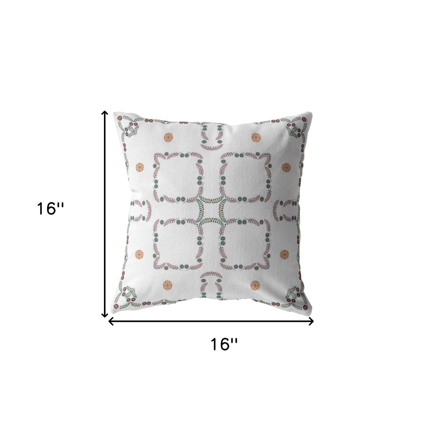 Accentuate a sense of purity and a bohemian vibe with this White Floral Indoor Outdoor Throw Pillow that will lighten up your living space when placed against bold-toned decors. The leafy pale red and pine green flower box pattern brings an alluring yet subdued contrast to the white base adding a bohemian flair to this pillow. The lustrous appearance of the broadcloth fabric adds to the visual appeal of the pillow while the characteristic durability makes this piece last for a long time in both indoor and outdoor settings. The soft and fluffy nature comes from the regular polyfill insert that provides a comfortable platform for your head and neck to maximize relaxation. This decorative accent stands out in class and coziness, providing a tranquil ambiance into your bohemian space. 16” x 16” x 5”