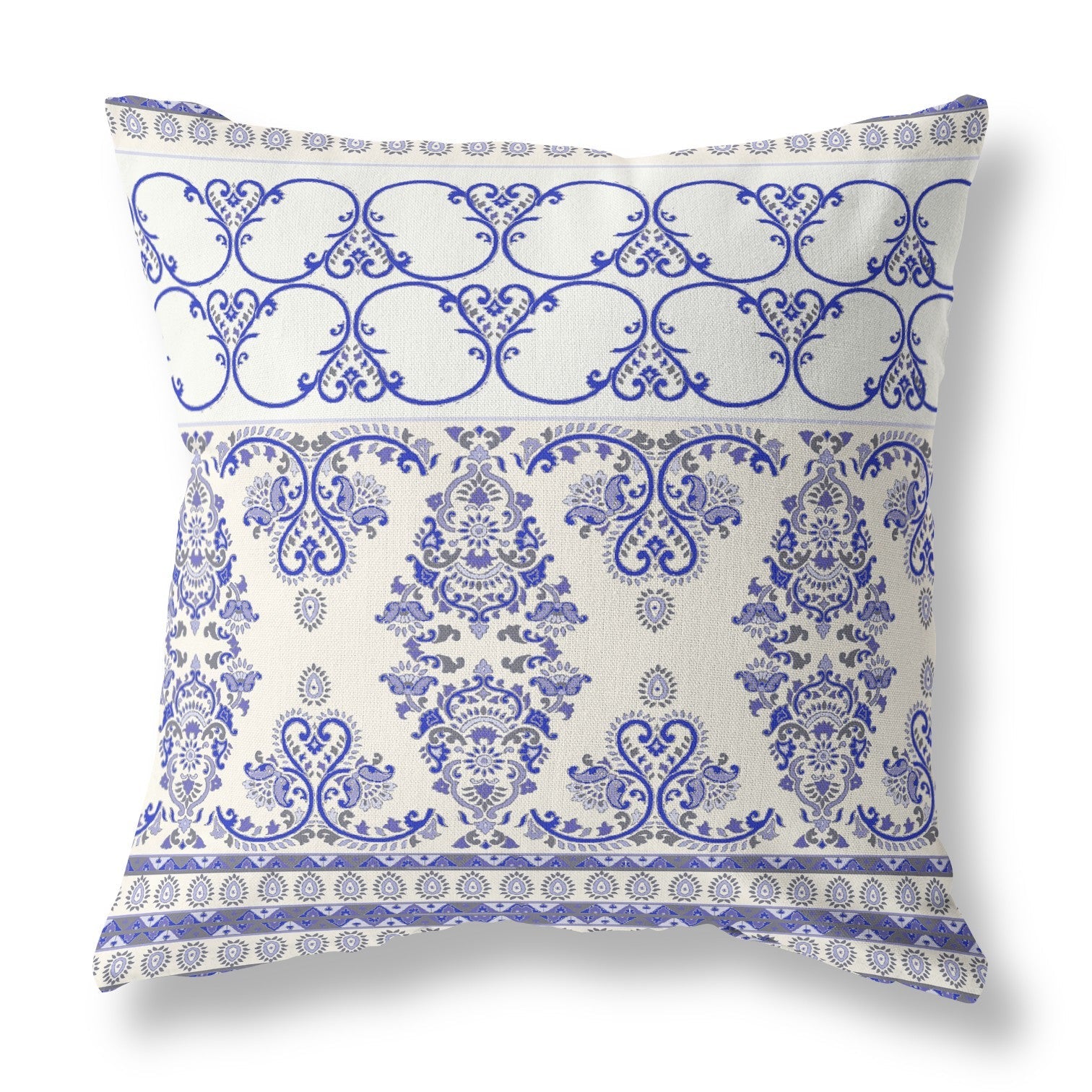 16" X 16" Off White And Blue Zippered Damask Indoor Outdoor Throw Pillow