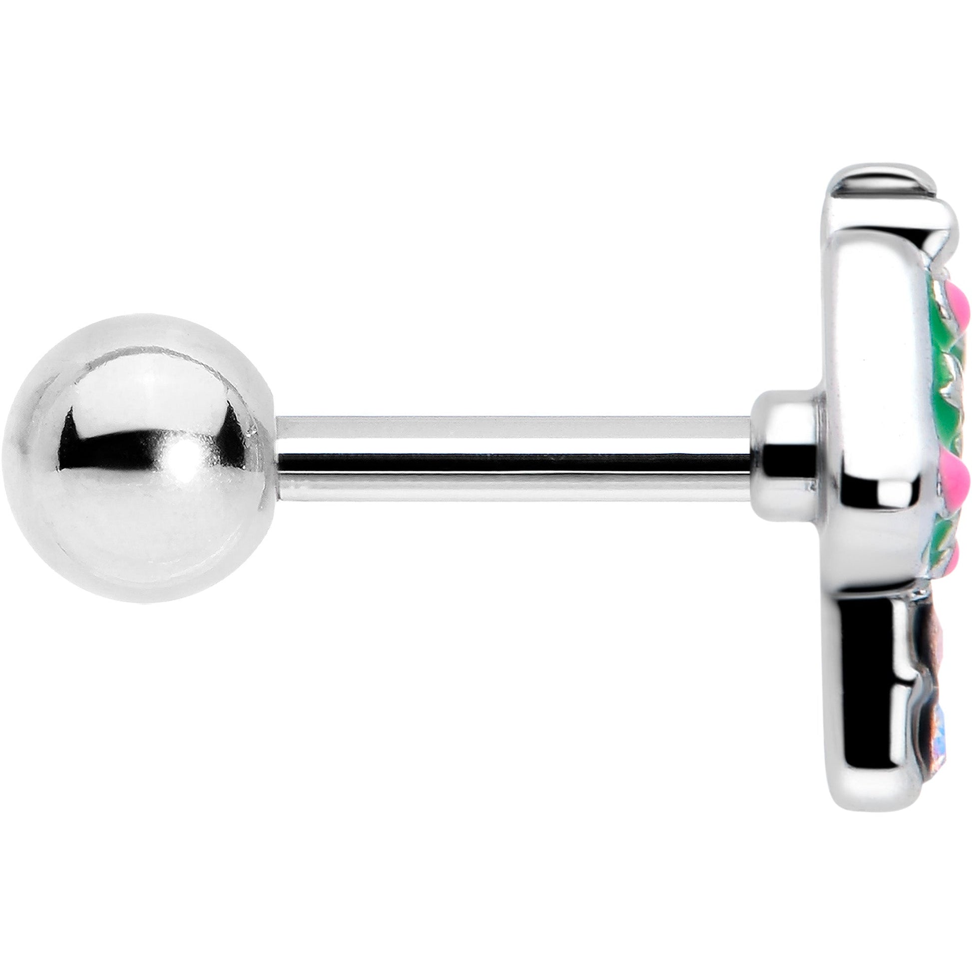 Get trippy in colorful style with this 16 gauge tragus stud. It is made with a 6mm durable 316L surgical grade stainless steel straight barbell with a 4mm ball end. It features a mushroom charm, with a green cap and pink embellishments as well as aurora gems in the stem. It's further embellished with mystical designs and a tiny snail perched on top and you can rock it in multiple piercings including tragus, helix, and some conch piercings. Get psychedelic style and elegant color with this modern mushroom cartilage piercing jewelry.Specifications