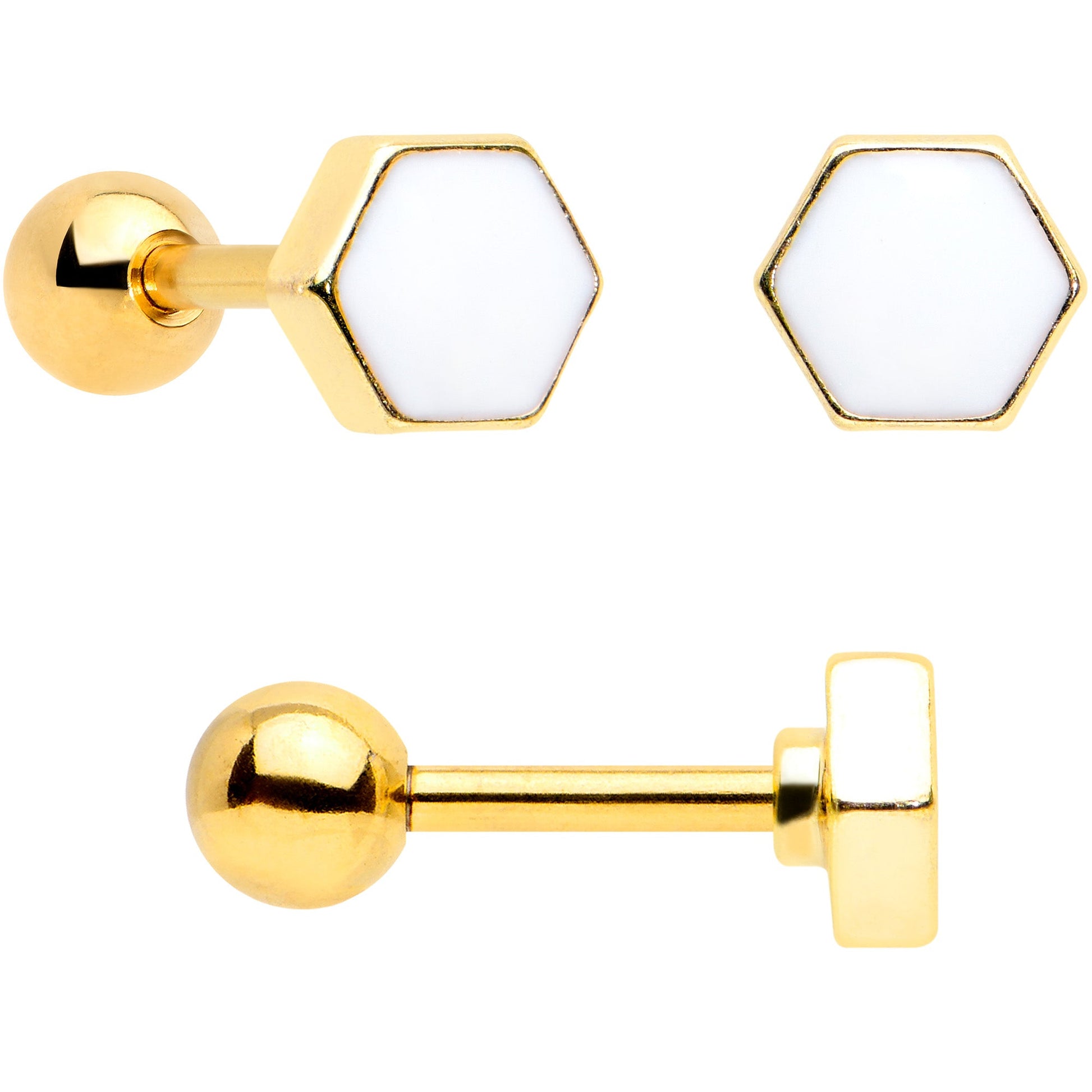 Your piercings will be all the buzz with this beehive-themed set of 16 gauge tragus studs, They're all 6mm and made with gold tone PVD over 316L surgical grade stainless steel straight barbells with 4mm ball ends. One features a small bee charm, with black detailing and a clear cubic zirconia gem embellishment. The second features a white beehive charm, showing one individual cell from the hive. The third one features a sunflower, embellished with black cubic zirconia gems at the center for a realistic appearance. You can even rock these in multiple piercings including tragus, helix, and some conch piercings. You'll bee buzzing with joy when you're rocking this cheery bee-themed cartilage piercing jewelry. Sold as a set of three.Specifications