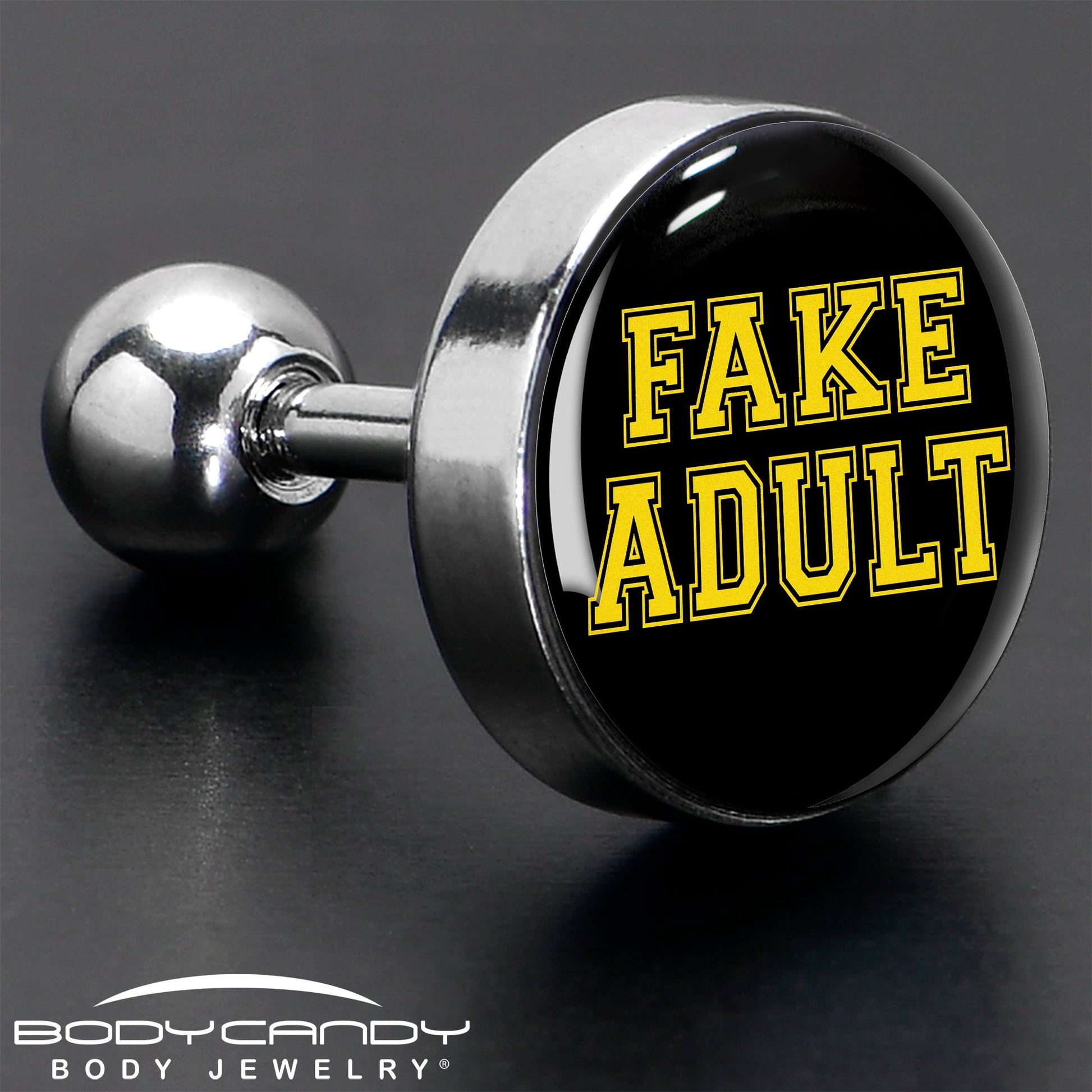 If you feel a teenager trapped in an adult body, this 16 gauge tragus stud is sure to please. It's made with a 6mm durable 316L surgical grade stainless steel straight barbell with a 4mm ball end. It features a black disc logo charm with the words Fake Adult in a yellow varsity-style font for truly intense color contrast and you can even rock it in multiple piercings including tragus, helix, and some conch piercings. Let the world know that you're faking it with this whimsical cartilage piercing jewelry.