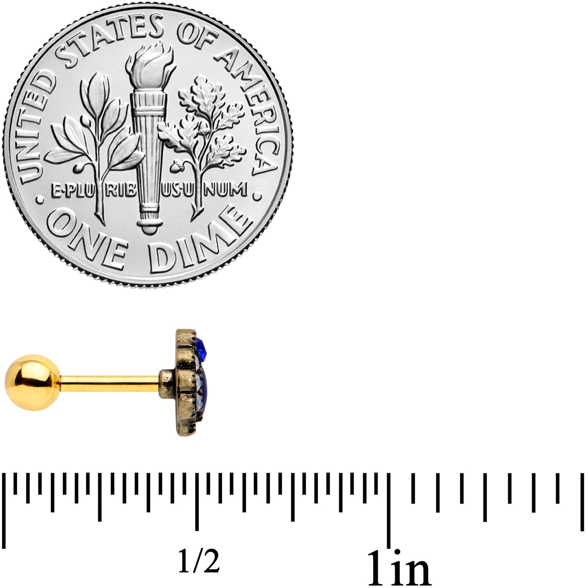 Get timeless style on very modern jewelry with this 16 gauge tragus stud. It's made with a 6mm gold tone PVD over 316L surgical grade stainless steel straight barbell with a 4mm ball end. It features a blue gem charm, with the top gem shaped like a teardrop and the one below it round. The charm is embellished with clear gems for a look that's opulent but not overwhelming and you can rock it in multiple piercings including tragus, helix, and some conch piercings. Take your look back in time with this gorgeous, antique-inspired cartilage piercing jewelry.Specifications