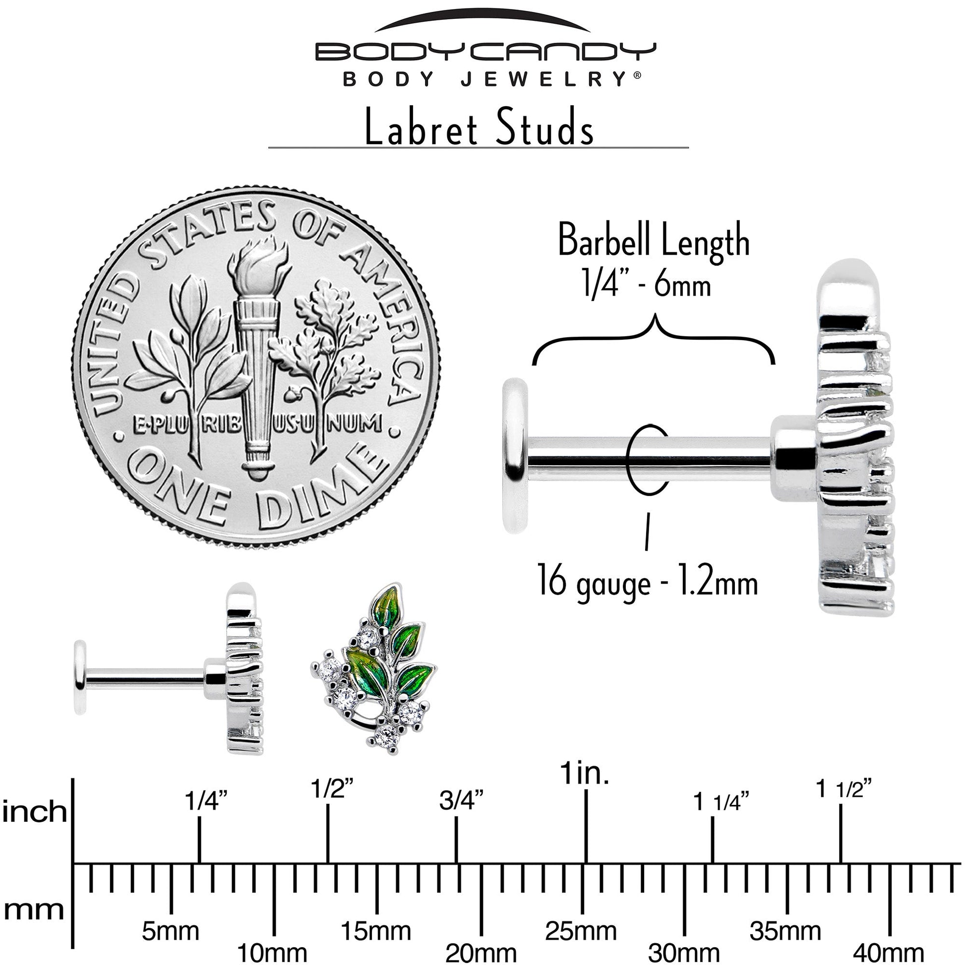 Let your look shine like the leaves in the morning with this 16 gauge lip ring. It's made with a 6mm durable 316L surgical grade stainless steel straight post with a flat disc end. It features a green inlaid leaves charm, set among clear cubic zirconia gems for a look reminiscent of the morning dew. You can even rock it in multiple piercings including tragus, helix, and some conch piercings. Let your look turn over a new leaf of elegance with this lovely, leafy cartilage piercing jewelry.Specifications