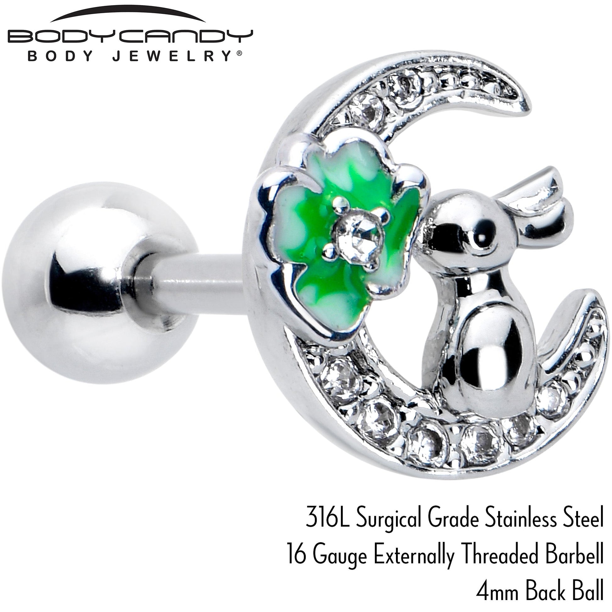 The little bunny on this 16 gauge tragus stud has gone exploring new realms. It's made with a 6mm durable 316L surgical grade stainless steel straight barbell with a 4mm ball end end. It features a crescent moon charm, paved with clear cubic zirconia gems. Sitting on the moon is a rabbit, with simple detailing and a black eye embellishment. The moon is further embellished with a green flower. You can even rock it in multiple piercings including tragus, helix and some conch piercings. Fall down a rabbit hole of style with this celestial bunny cartilage piercing jewelry.Specifications