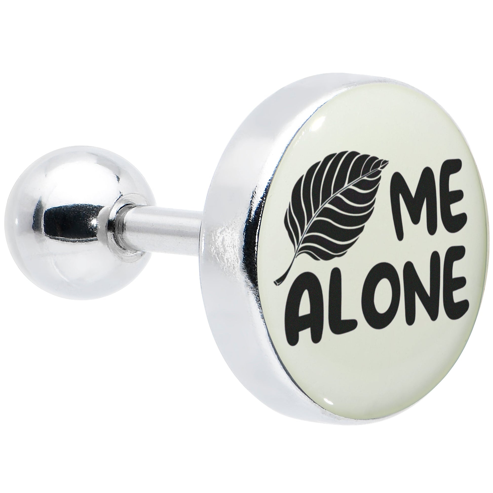 If you're a true introvert, tell the world to give you your space without actually having to talk to anyone with this 16 gauge tragus stud. It's made with a 6mm durable 316L surgical grade stainless steel straight barbell with a 4mm ball end. It features a white disc logo charm. It features a "leaf" Me Alone design with a tiny leaf standing in for the word and when the lights go down it glows in the dark. You can even rock it in multiple piercings including tragus, helix, and some conch piercings. Avoid conversation in style with this glow in the dark cartilage piercing jewelry.