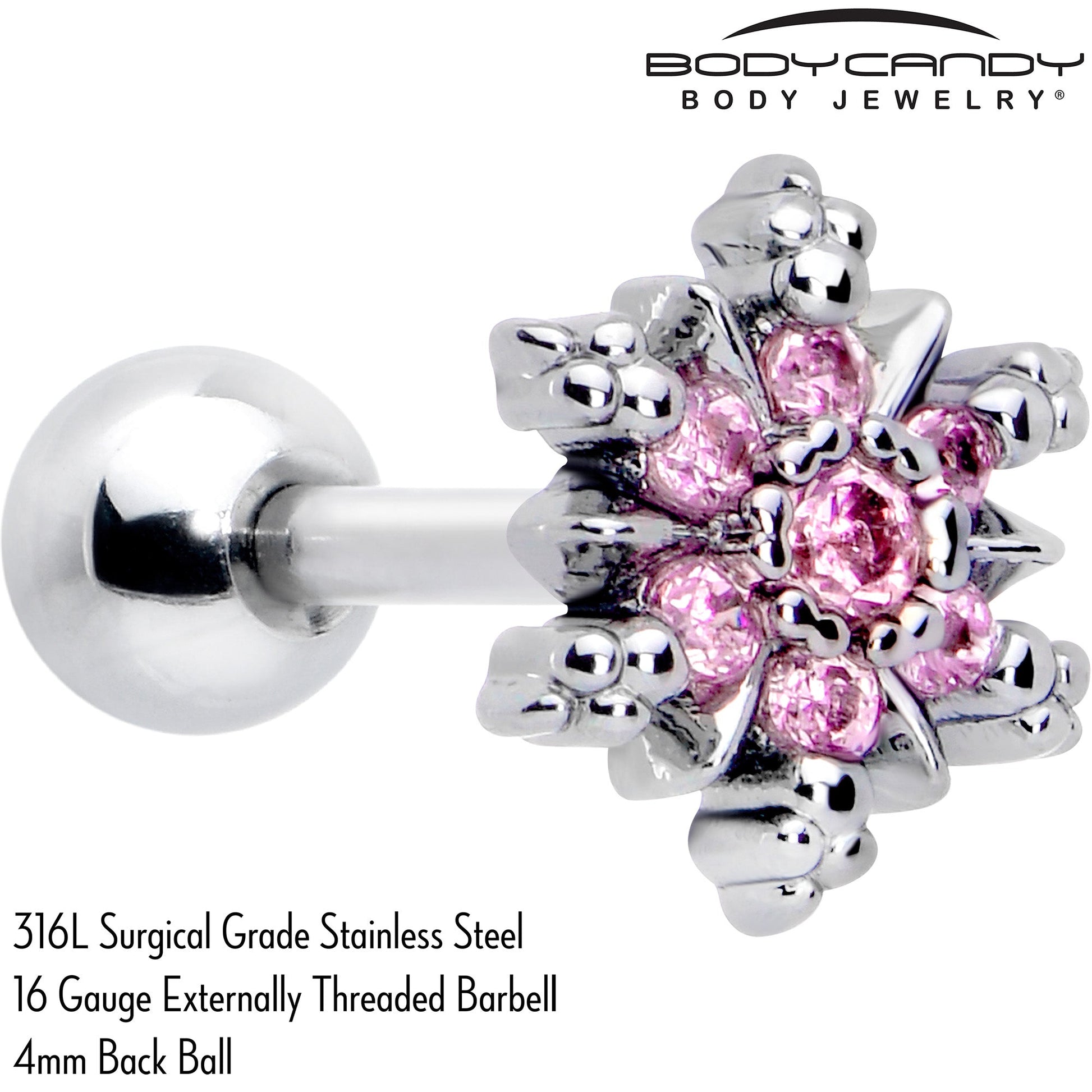 This winter, get fashionable and funky with the glamorous snowflakes on this 16 gauge tragus stud. It's made with a 6mm durable 316L surgical grade stainless steel straight barbell with a 4mm ball end. It features a heavily ornamented snowflake charm, with pink cubic zirconia gem embellishments and textured detailing. You can even rock it in multiple piercings including tragus, helix and some conch piercings. You'll have glamour to spare all winter long with this stylish snowflake cartilage piercing jewelry.Specifications