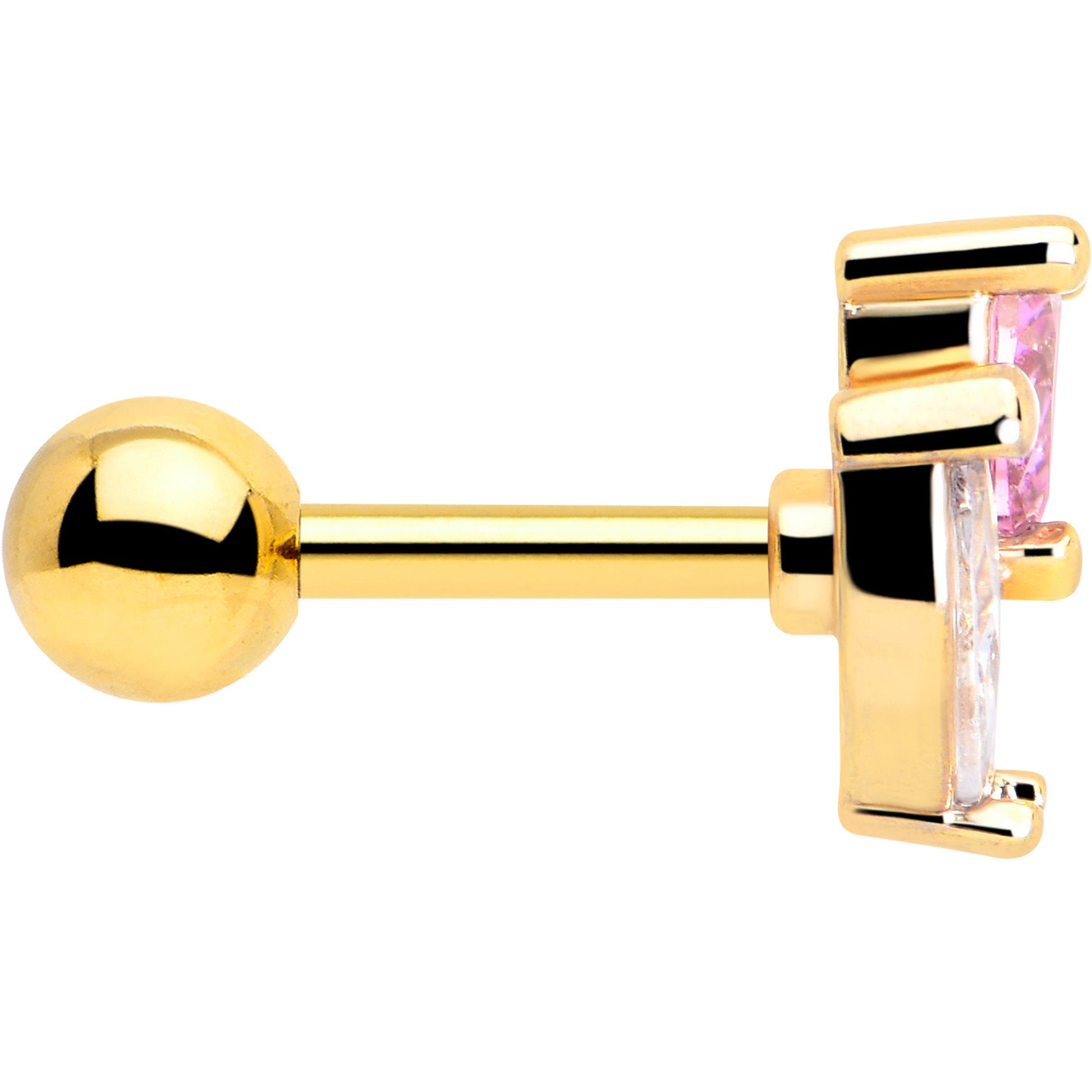 Let love bloom along with your look when you're rocking this 16 gauge tragus stud. It's made with a 6mm gold tone PVD over 316L surgical grade stainless steel straight barbell with a 4mm ball end. It features a flower charm with clear cubic zirconia gem leaves. The blossom is composed of a pink cubic zirconia gem heart for a sweetly romantic touch you can't help but love and you can even rock it in multiple piercings including tragus, helix, and some conch piercings. Let your love flower in style with this romantic cartilage piercing jewelry.Specifications