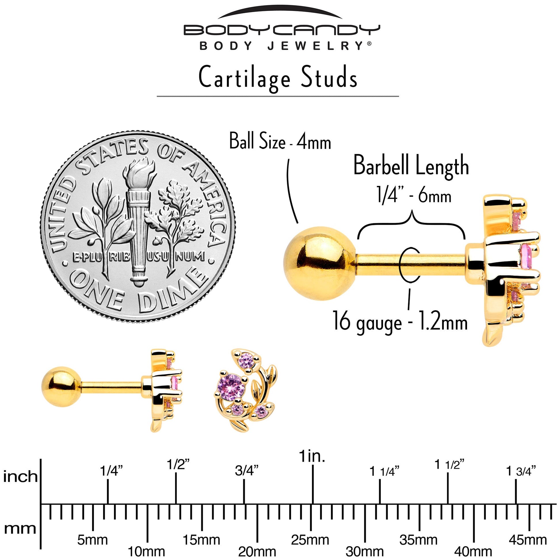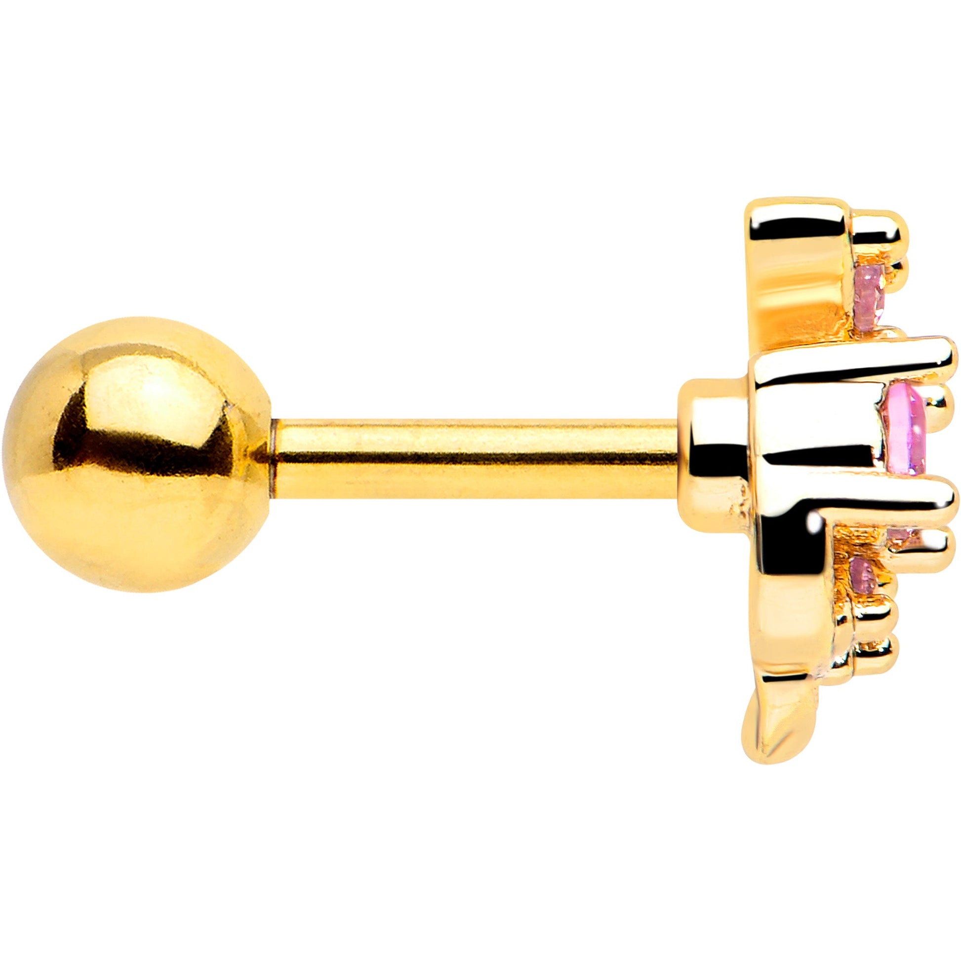 You'll be looking fine when you're rocking the vine on this 16 gauge tragus stud. It's made with a 6mm gold tone PVD over 316L surgical grade stainless steel straight barbell with a 4mm ball end. It features a leafy vine charm, with the leaves set with pink gems for a gorgeous color contrast. It's further embellished with unadorned leaves for added visual impact and you can rock it in multiple piercings including tragus, helix, and some conch piercings. This cartilage piercing jewelry is sure to grow on you.Specifications