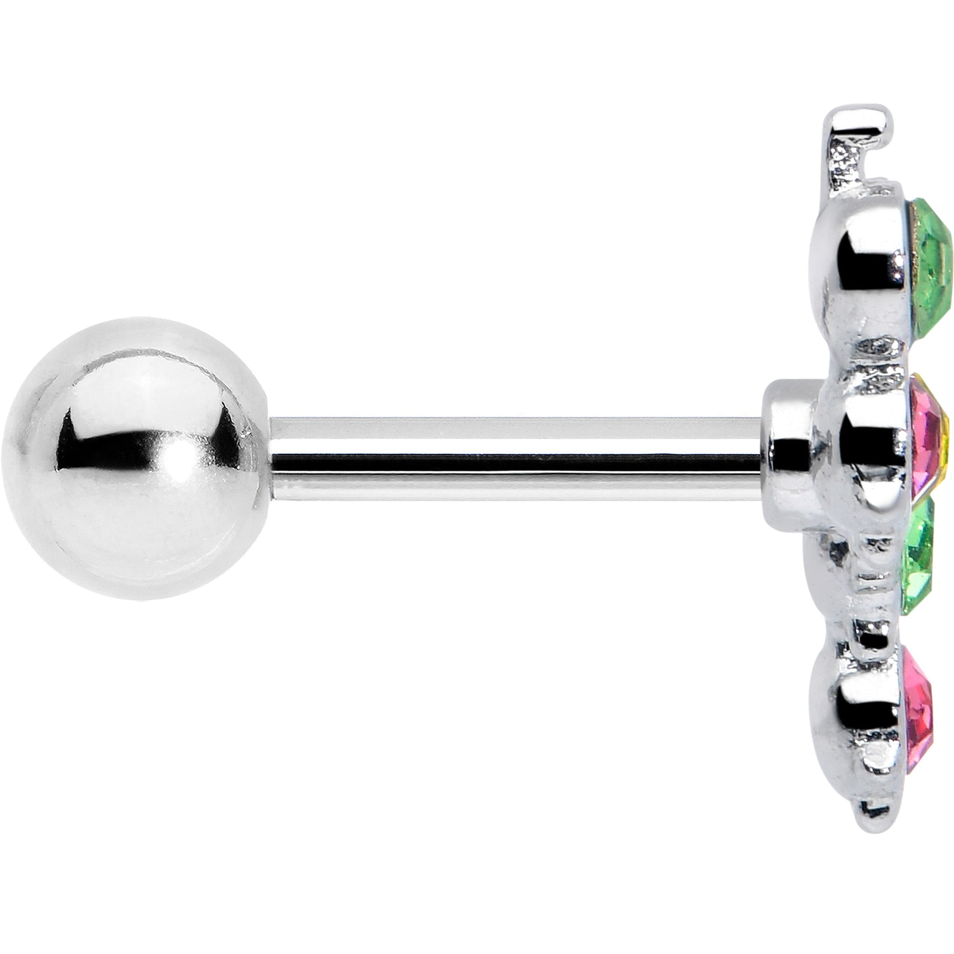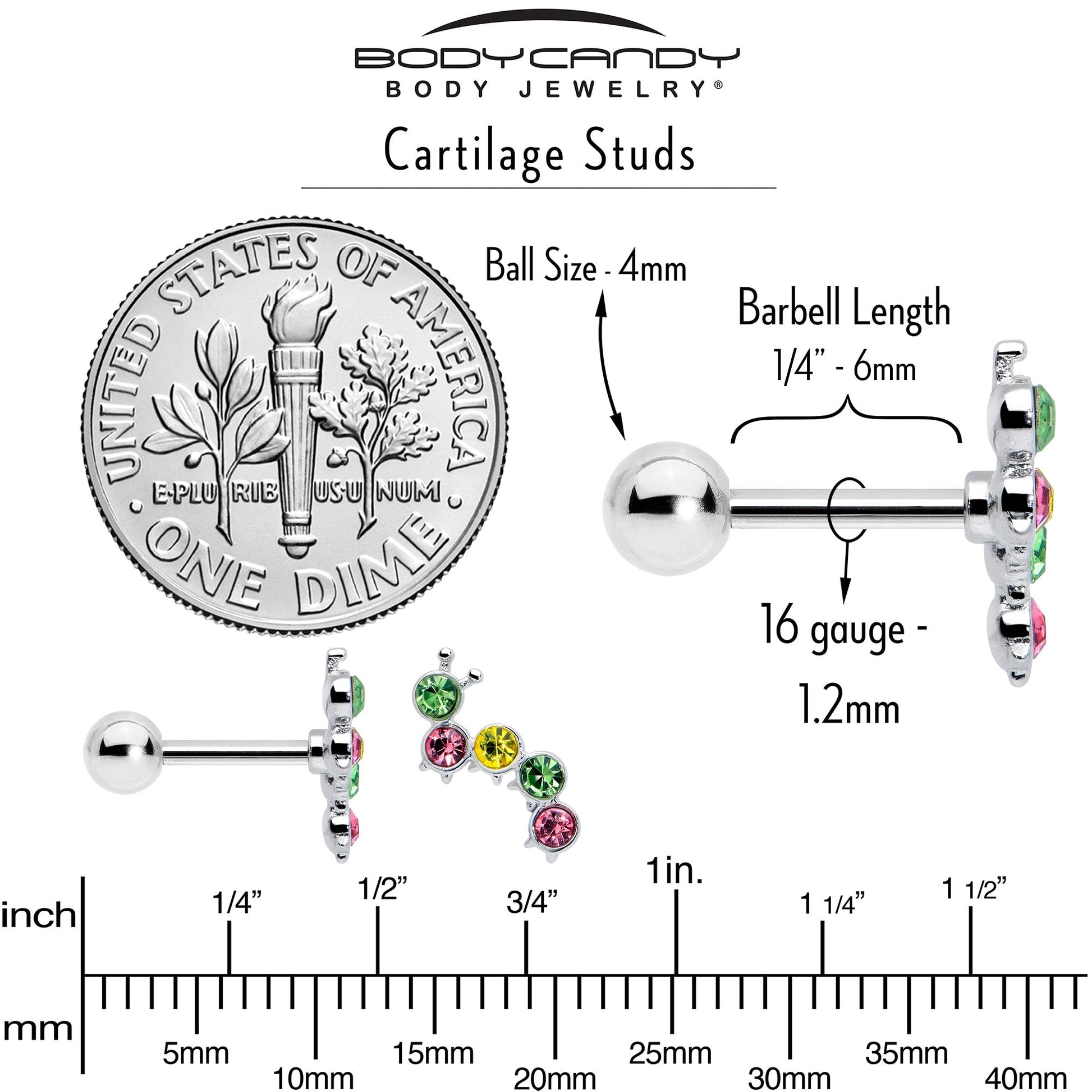 Get hungry for floral fabulousness with the caterpillar on this 16 gauge tragus stud. It is made with a 6mm durable 316L surgical grade stainless steel straight barbell with a 4mm ball end. It features a caterpillar charm, composed entirely of green, pink, and yellow gems. It is further embellished with tiny antennae detailing and you can even rock it in multiple piercings including tragus, helix, and some conch piercings. Conjure a whimsical new style with this insect cartilage piercing jewelry.Specifications