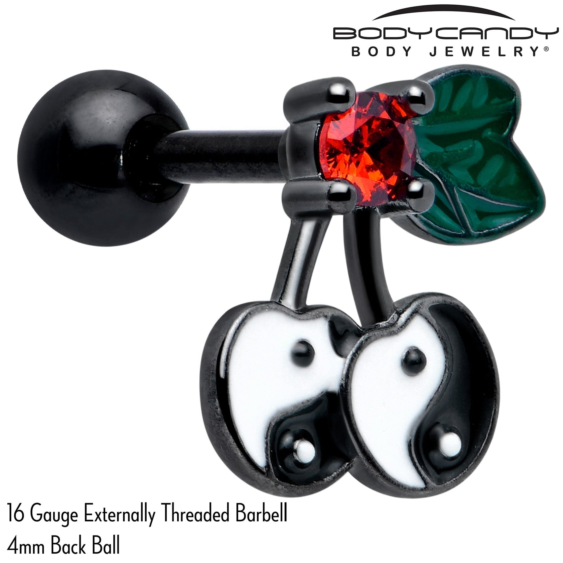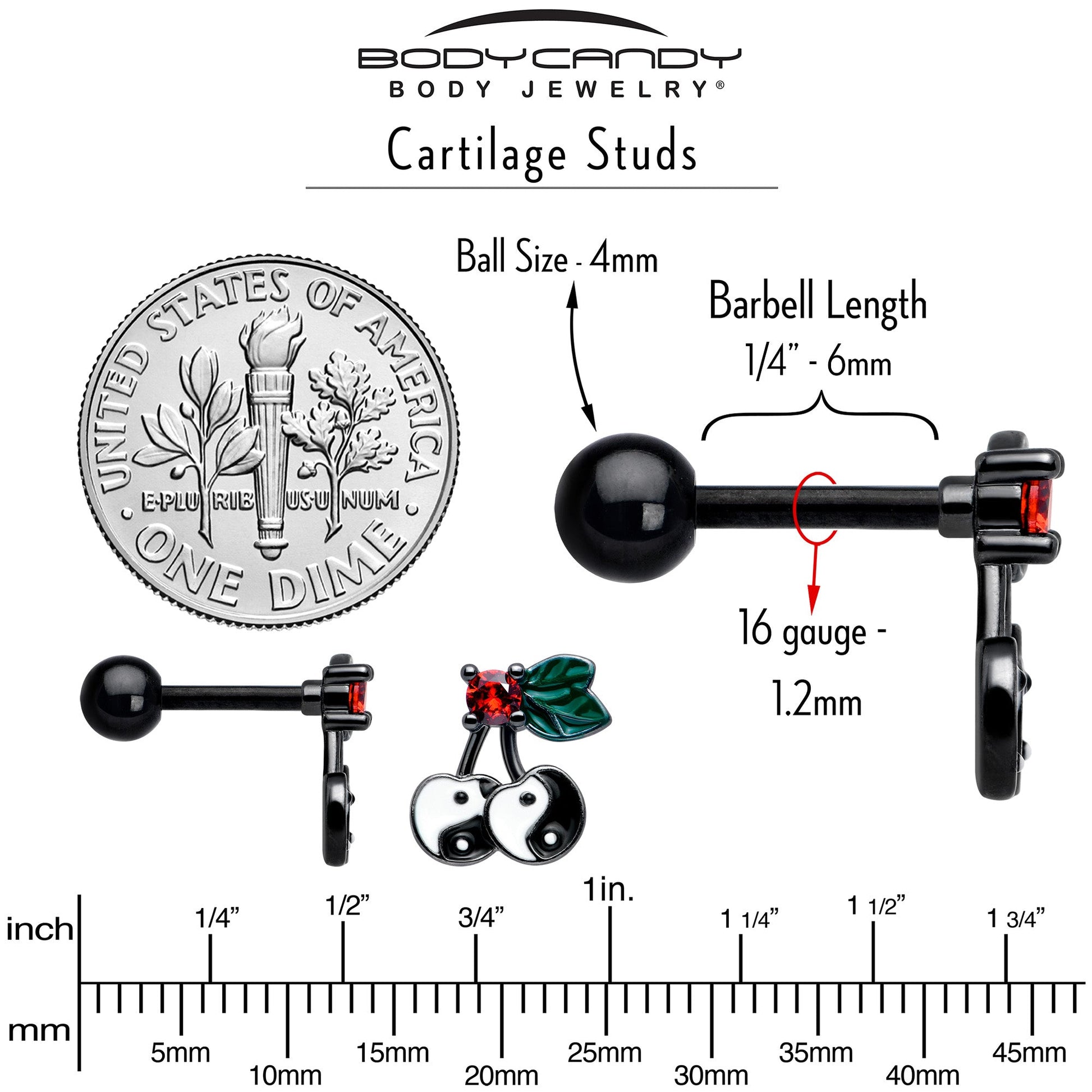 Get a whimsical look with a spiritual touch with this 16 gauge tragus stud. It is made with a 6mm black PVD over 316L surgical grade stainless steel straight barbell with a 4mm ball end. It features a cherries charm with a red cubic zirconia gem embellishment. The cherry fruit are feature yin yang symbols, inlaid in black and white. You can even rock it in multiple piercings including tragus, helix, and some conch piercings. You are sure to love this tasty cartilage piercing jewelry all the way down to your soul.Specifications