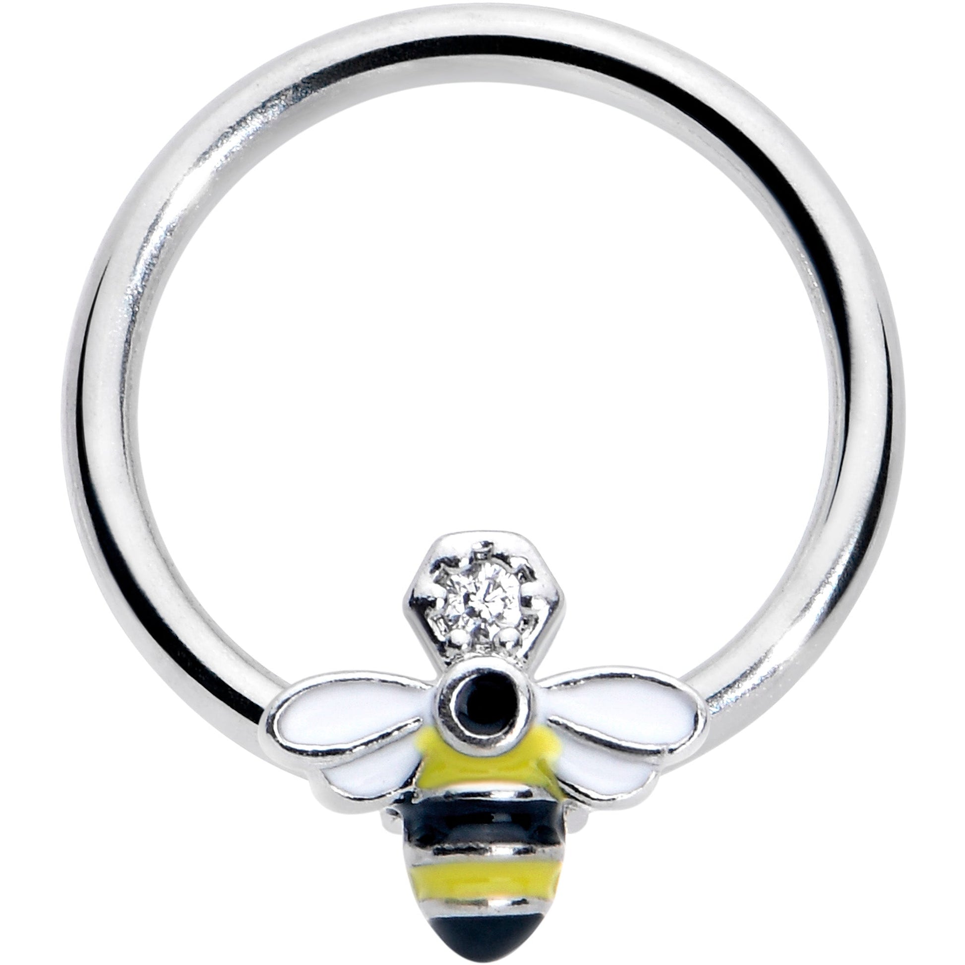 You'll bee the hottest bee in the hive with this 16 gauge septum ring. It's made with a 10mm durable 316L surgical grade stainless steel circular ring with a captive design for secure wear. It features a bee captive charm with black and yellow stripes and white wings for an understated appearance. The bee is further embellished with a clear cubic zirconia gem head and you can even rock it in multiple piercings including tragus, helix, and some daith piercings. Whether you're a worker, a drone, or the queen, you'll be the sweetest looking honey in the room with this elegant honeybee cartilage piercing jewelry.Specifications
