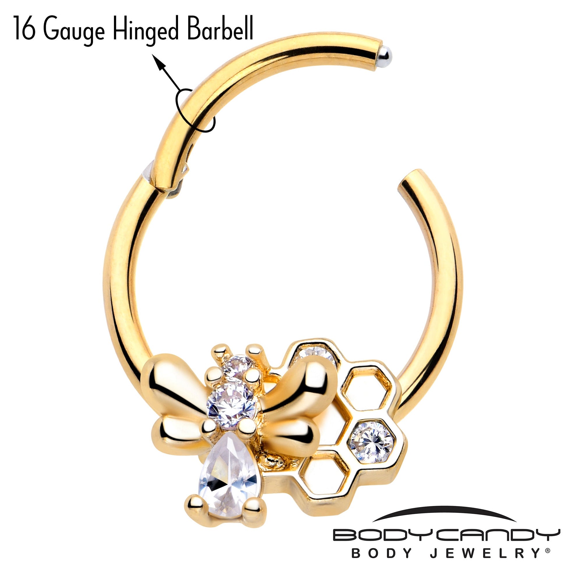 You'll bee the hottest bee in the hive with this 16 gauge septum ring. It's made with a 10mm gold tone PVD over 316L surgical grade stainless steel hinged circular ring. It features a honeycomb charm, set with clear cubic zirconia gems. Perched beside it is a bee charm with the body composed entirely of clear cubic zirconia gems and contrasting wings. It also features a non-removable, hinged segment that makes insertion and removal a breeze and you can rock it in multiple piercings including tragus, helix, and some daith piercings. Whether you're a worker, a drone, or the queen, you'll be the sweetest looking honey in the room with this elegant bee and honeycomb cartilage piercing jewelry.Specifications