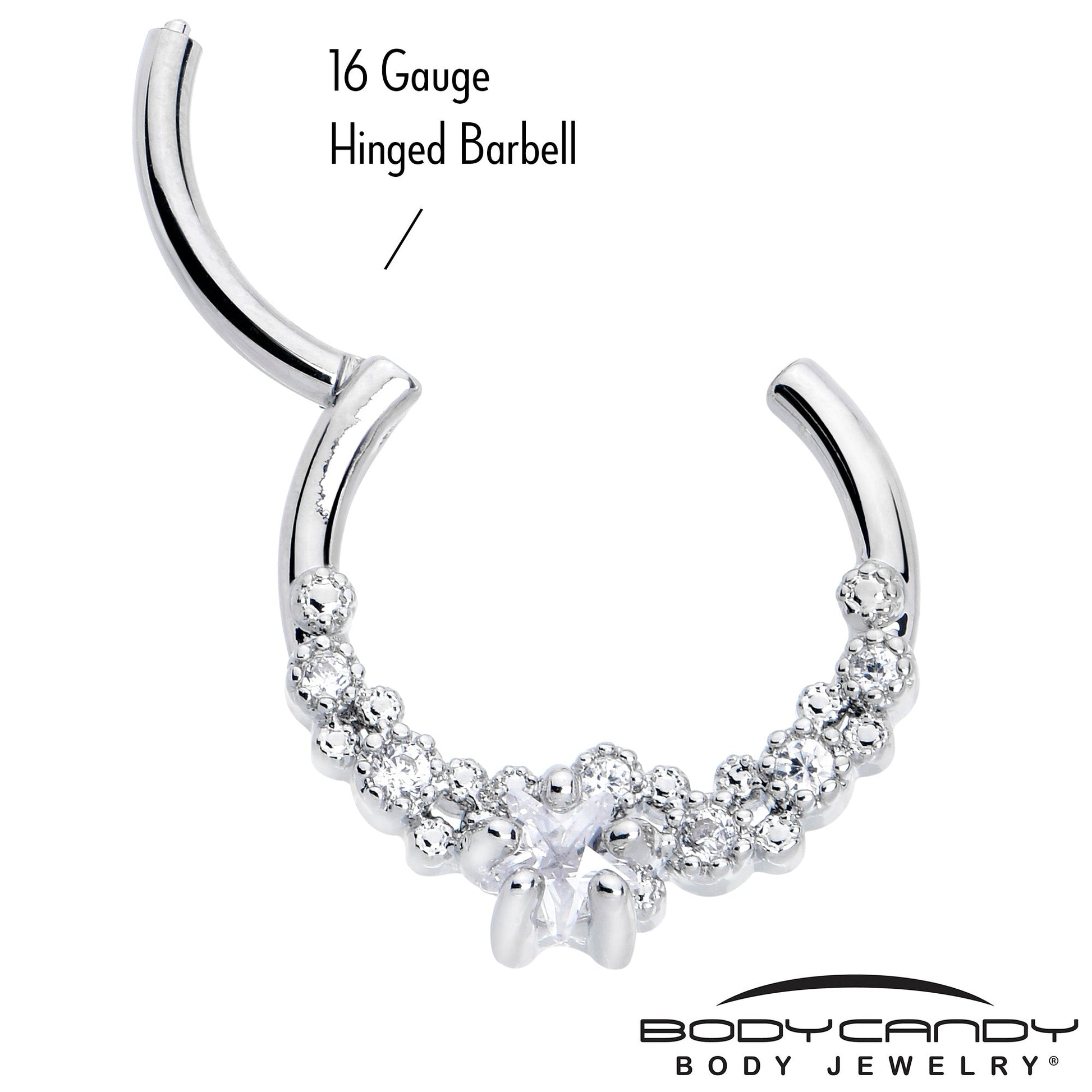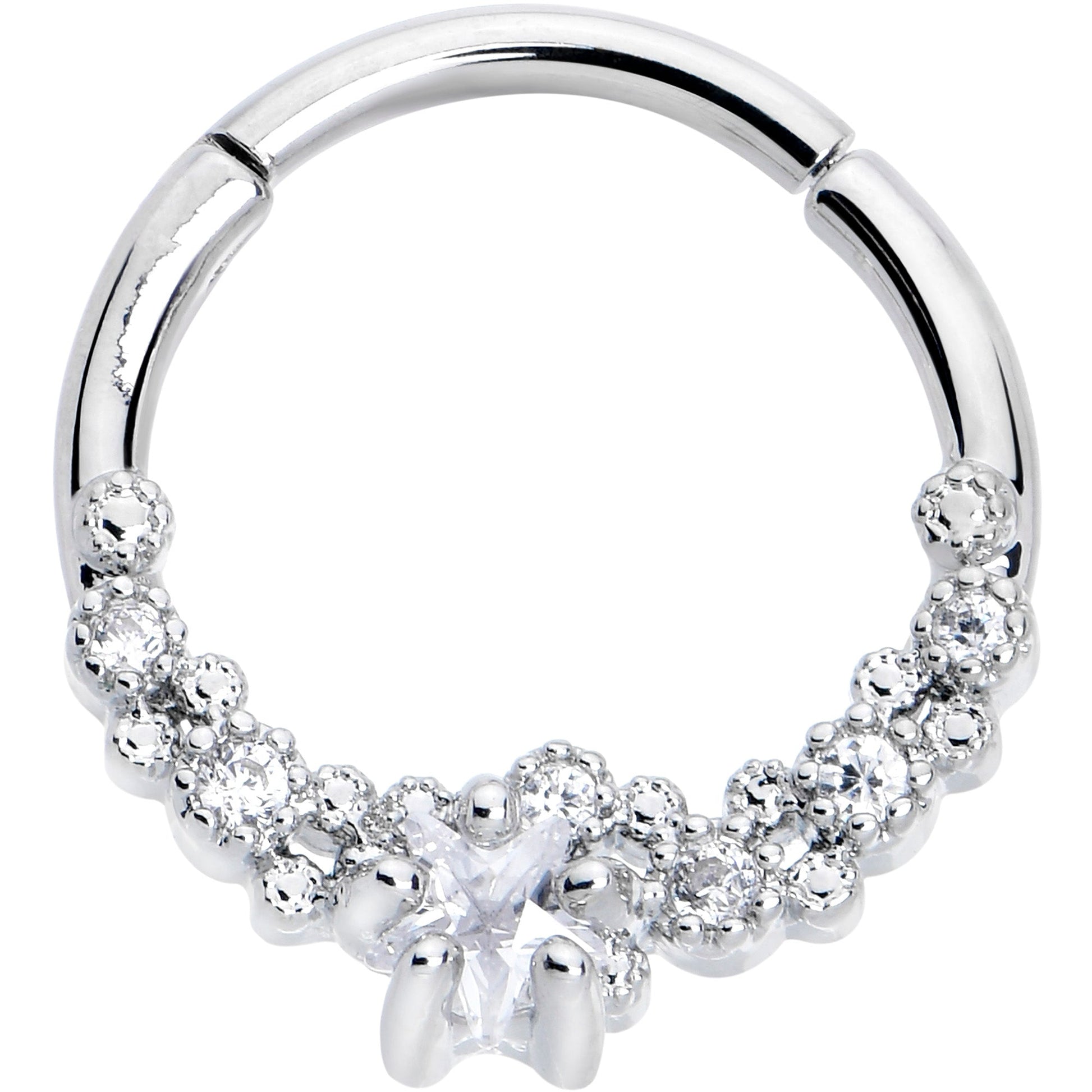 Add some luxurious starfish style to your look with this 16 gauge septum ring. It's made with a 10mm durable 316L surgical grade stainless steel hinged circular ring. It features a clear cubic zirconia gem starfish at the bottom center. It's further embellished with round, clear cubic zirconia gems to emulate bubbles up the sides for a rich and nautical look. It also features a hinged, non-removable segment that makes insertion and removal a breeze and you can rock it in multiple cartilage piercings like the daith, helix, and tragus. Be the most stylish star on the shore with this elegant cartilage piercing jewelry.Specifications